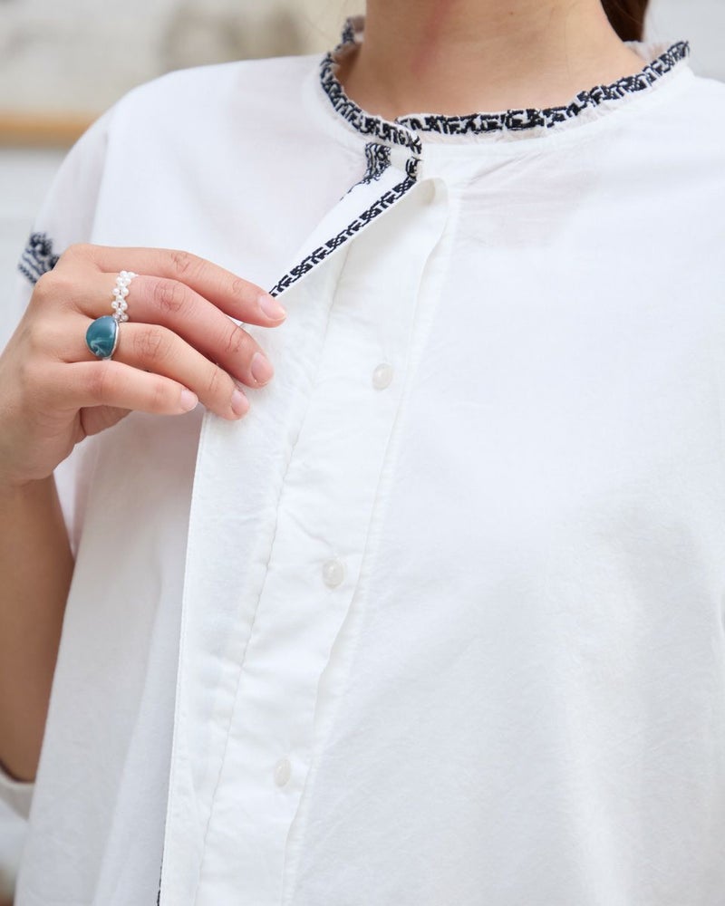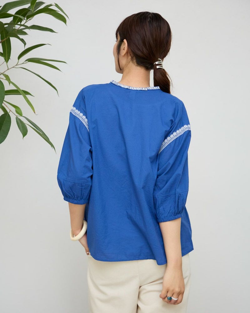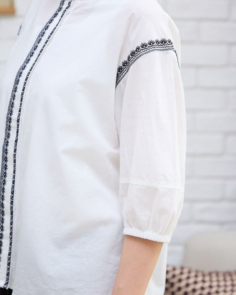 部分的に施した刺しゅうが全体を引き締めて大人かわいいブラウスです。袖口はフワッとゴム仕様でシルエットにニュアンスを出しています。比翼仕立ての前開きで着脱も楽です。 モデル身長: 168 cm 着用サイズ: M サイズ Golden Bear WOMEN ブラウス (WOMEN) 同デザイン大きい(3L,4Lサイズ)はこちら 【着用アイテム】468R3450 タンクトップ 467R5711 テーパードパンツ
