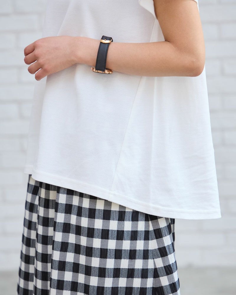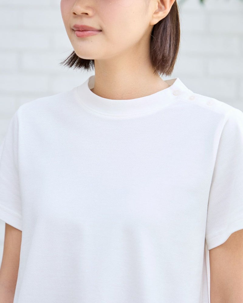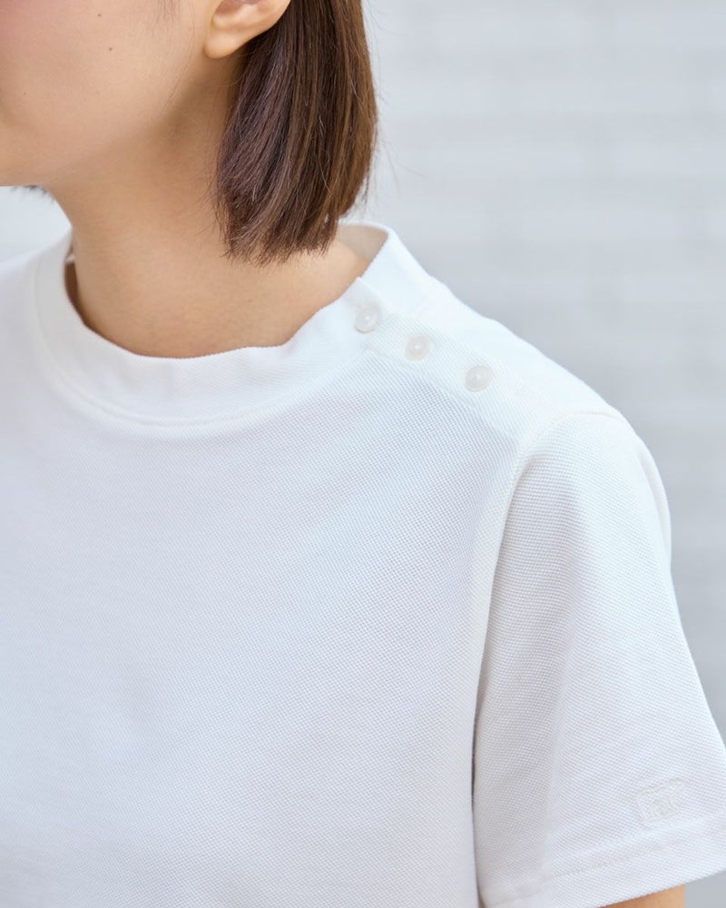 オーガニックコットン100%のかのこ素材を使用したカットソーです。低めのスタンドカラーで襟元が気になる方にもおすすめです。袖の枠のくま刺繍がアクセントです。 モデル身長: 167 cm 着用サイズ: M サイズ Golden Bear WOMEN カットソー (WOMEN) 【着用アイテム】467R6710 テーパードパンツ 468R6760 チェックスカート