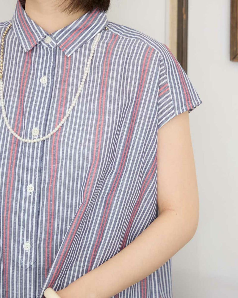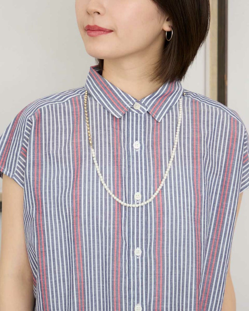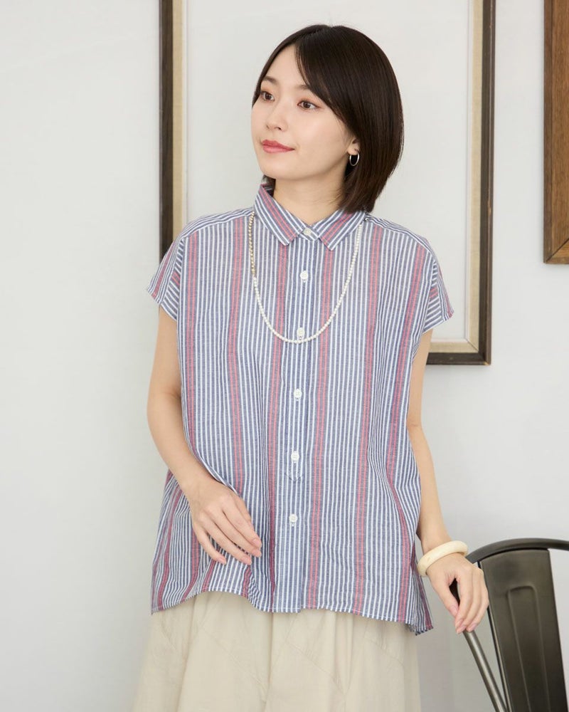 ドビー柄のストライプフレンチスリーブシャツです。清涼感のある綿麻素材を使用。ボックスシルエットなので風通りよく軽やかなデザインです。ボリュームのあるボトムやスカートともバランスよく着用して頂けます。 モデル身長: 162 cm 着用サイズ: M サイズ Golden Bear WOMEN ブラウス (WOMEN) 【着用アイテム】467R4703 スカート 467R7703 クロップドパンツ