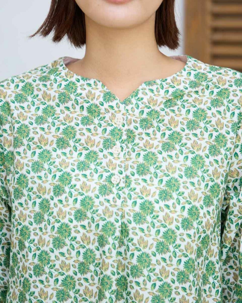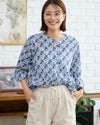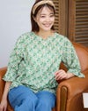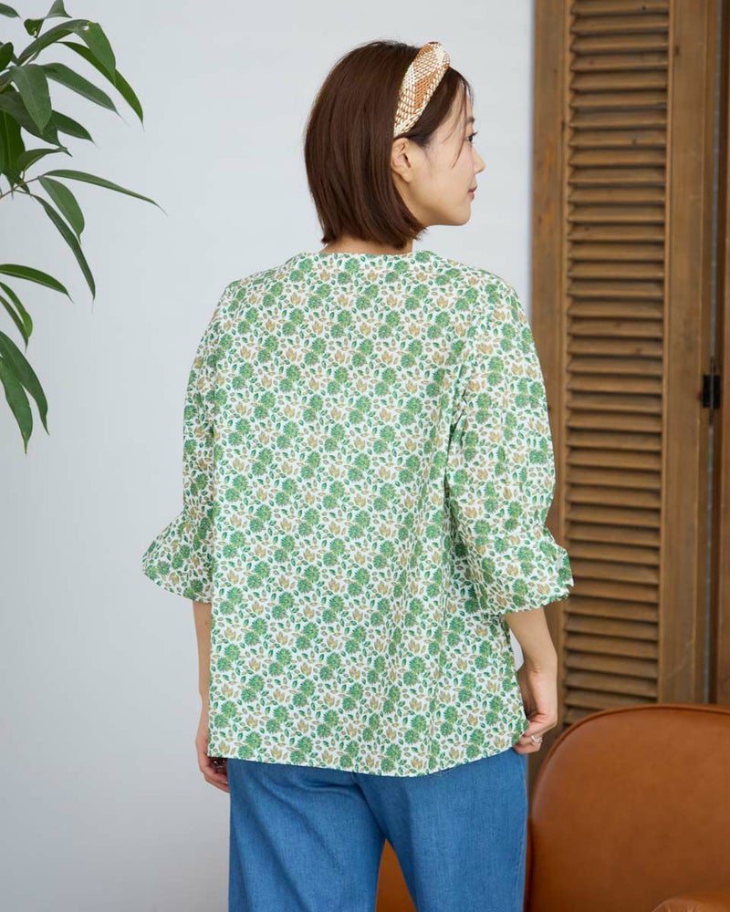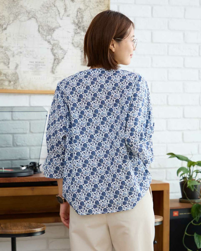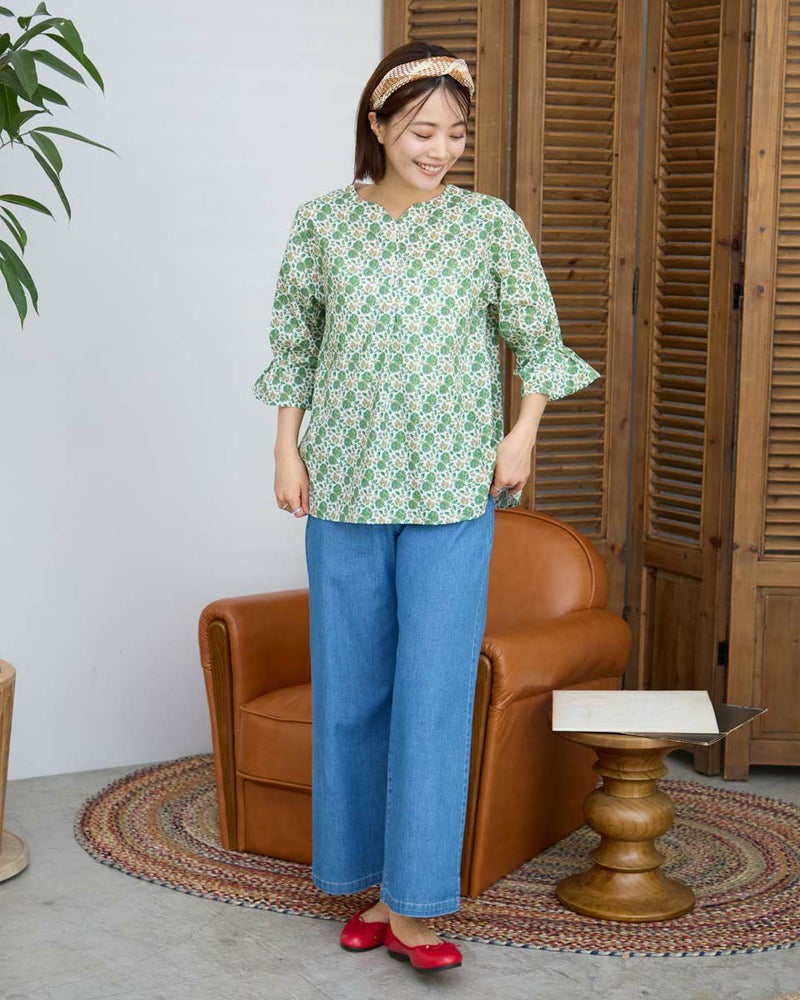 袖のさりげないタックデザインがポイントのブラウスです。爽やかな小花柄が涼しげでカジュアルなデニムパンツとの合わせがお勧めです。 モデル身長: 167 cm 着用サイズ: M サイズ Golden Bear WOMEN ブラウス (WOMEN) 【着用アイテム】467R8702 セミワイドパンツ