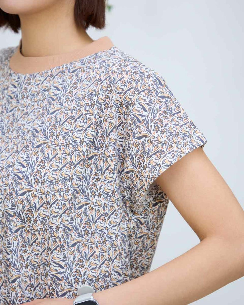 小さな花柄がやさしい雰囲気のTシャツ。袖はすっきり着用できるフレンチスリーブです。襟元には伸びのよいテレコ素材を使い、着脱もラクに。軽くて柔らかく、暑い季節も快適に過ごせます。カラーはシックな雰囲気にまとめたオレンジと、グリーンの2色展開。1枚でコーデが華やぐアイテムです。 モデル身長: 167 cm 着用サイズ: M サイズ Golden Bear WOMEN カットソー (WOMEN) 同デザイン大きい(3L,4Lサイズ)はこちら 【着用アイテム】467R7711 ストレートカーゴパンツ