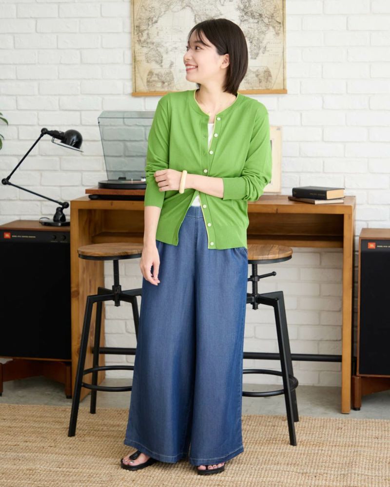 1枚あると便利なUVカットカーディガンです。綿ポリエステルのサラッとした素材を使用しています。襟元のライン使いがアクセントです。 モデル身長: 162 cm 着用サイズ: M サイズ Golden Bear Ladies' ニット (Ladies') 【着用アイテム】467R7402 レタードTシャツ 467R4703 スカート 467R7702 ガウチョパンツ