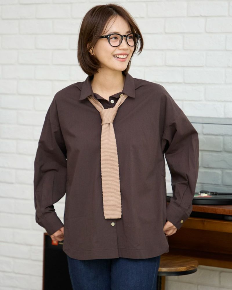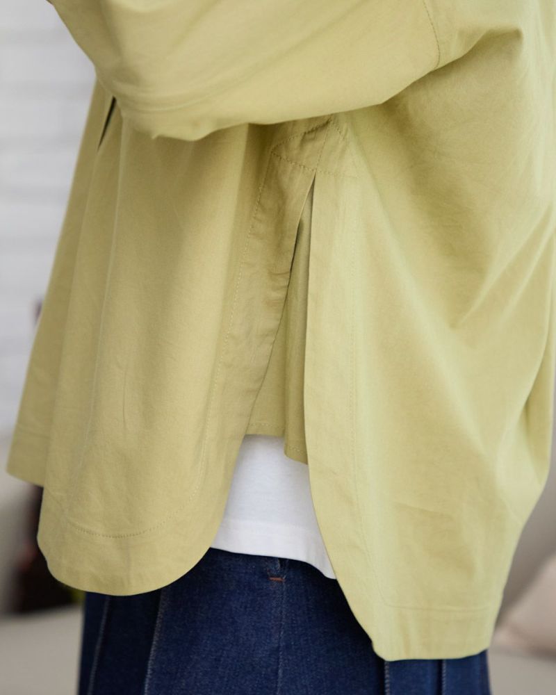 シンプルな中にひと工夫、サイドにさりげないレイヤーデザインを加えました。軽やかな素材で着心地もよく、シャツとしても羽織りとしても使える便利な1枚。着回し自在なアイテムです。
