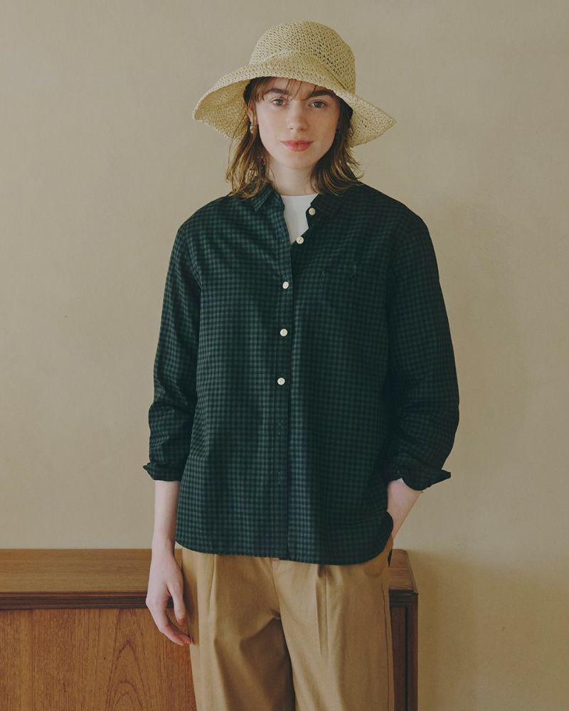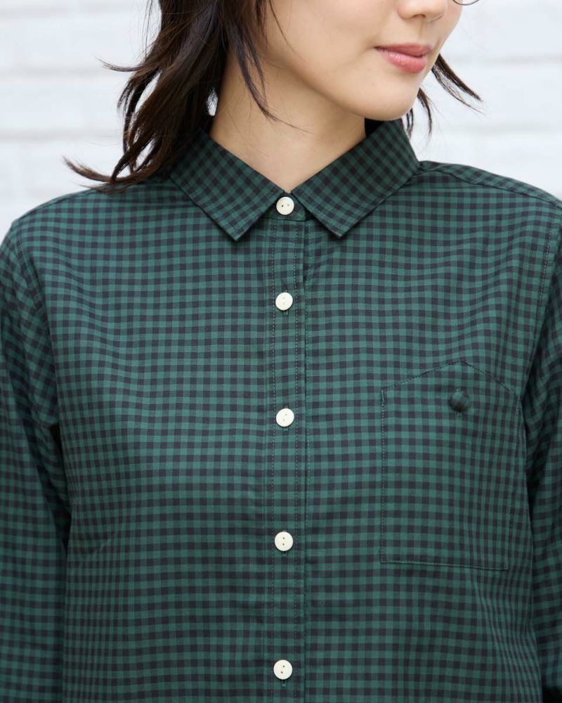 大好きなグリーンのシャツ。ポケットの部分にあるくるみボタンがとてもかわいいです。素材もよく長い期間着れると思い購入しました。色違いの購入も検討しております。