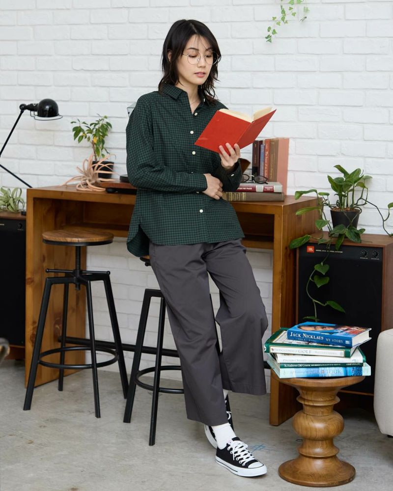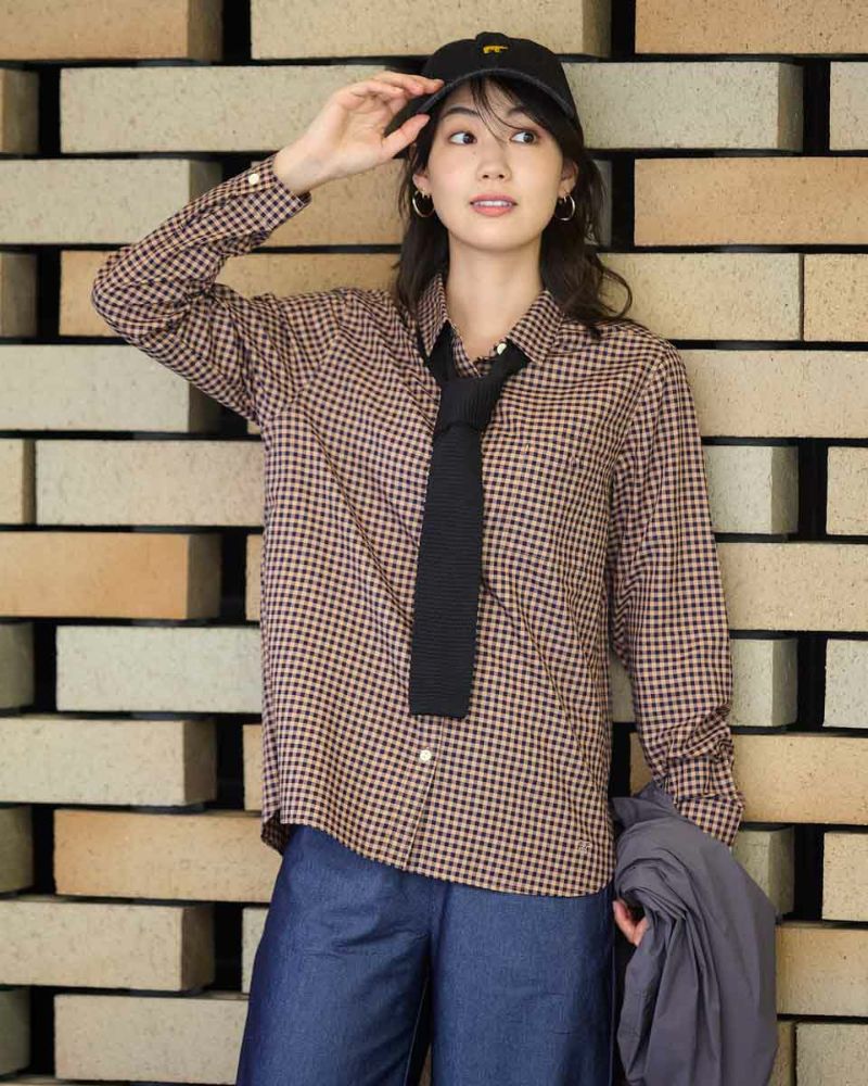 落ち着いたカラーのチェック柄素材を使用しています。ポケットのデザインが特徴的です。オールシーズンに対応でき、インでもアウトでも着こなし自在なシャツになっています。