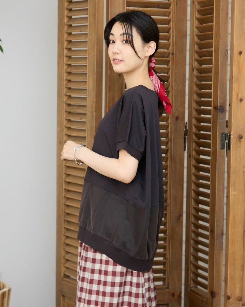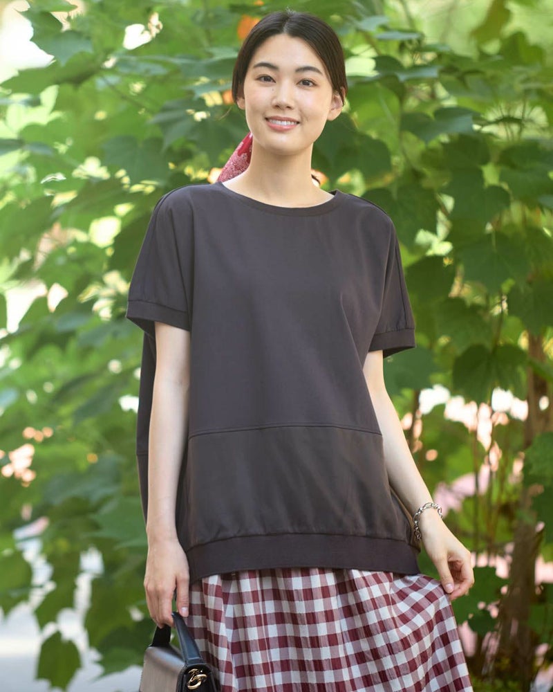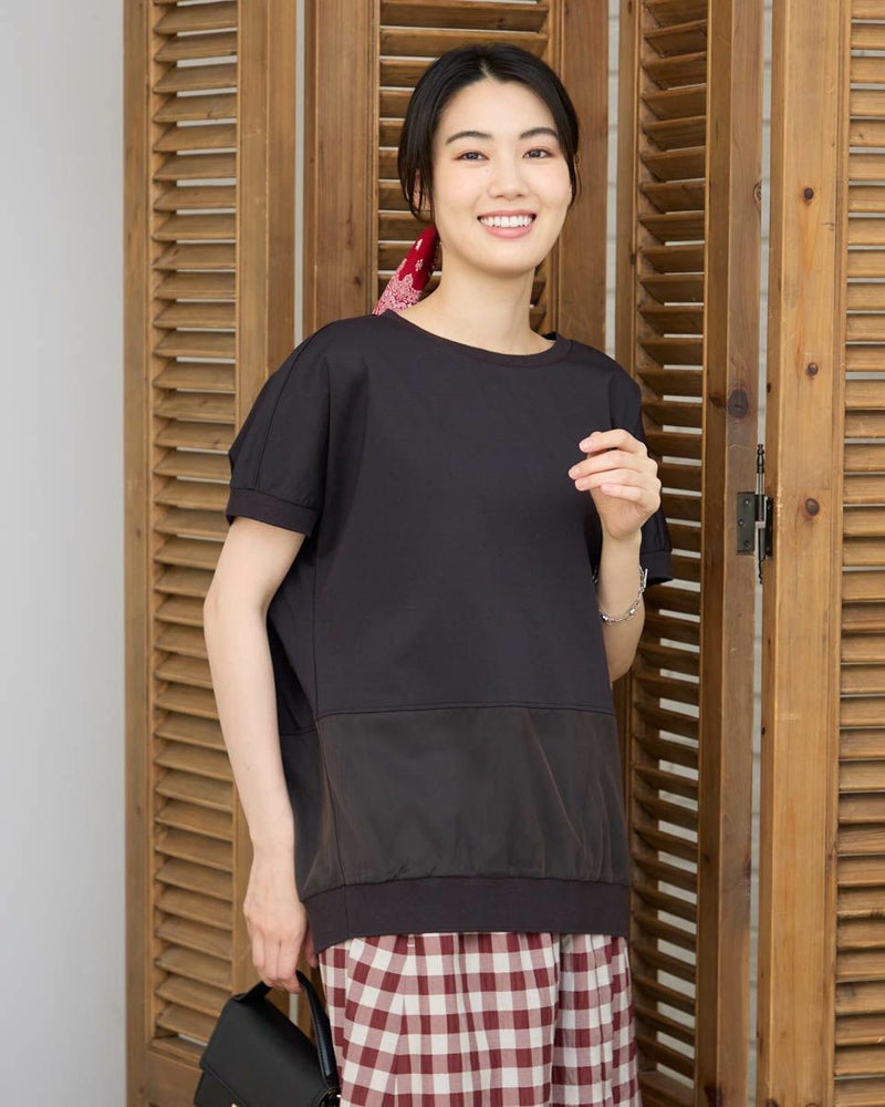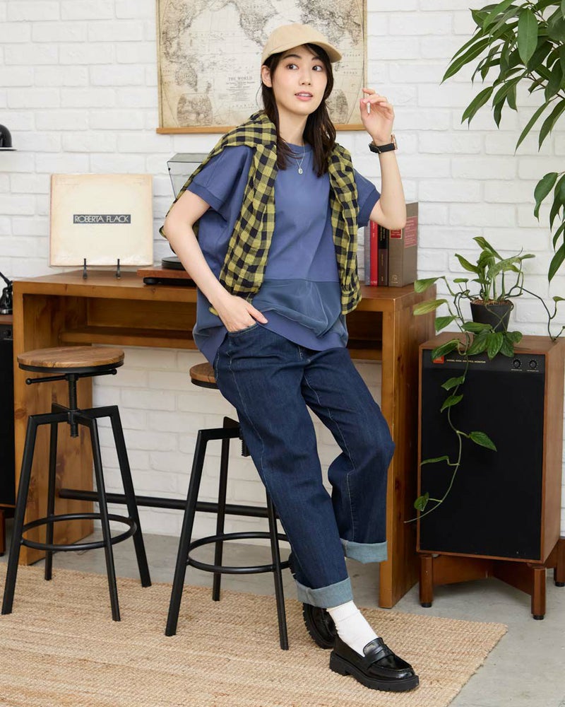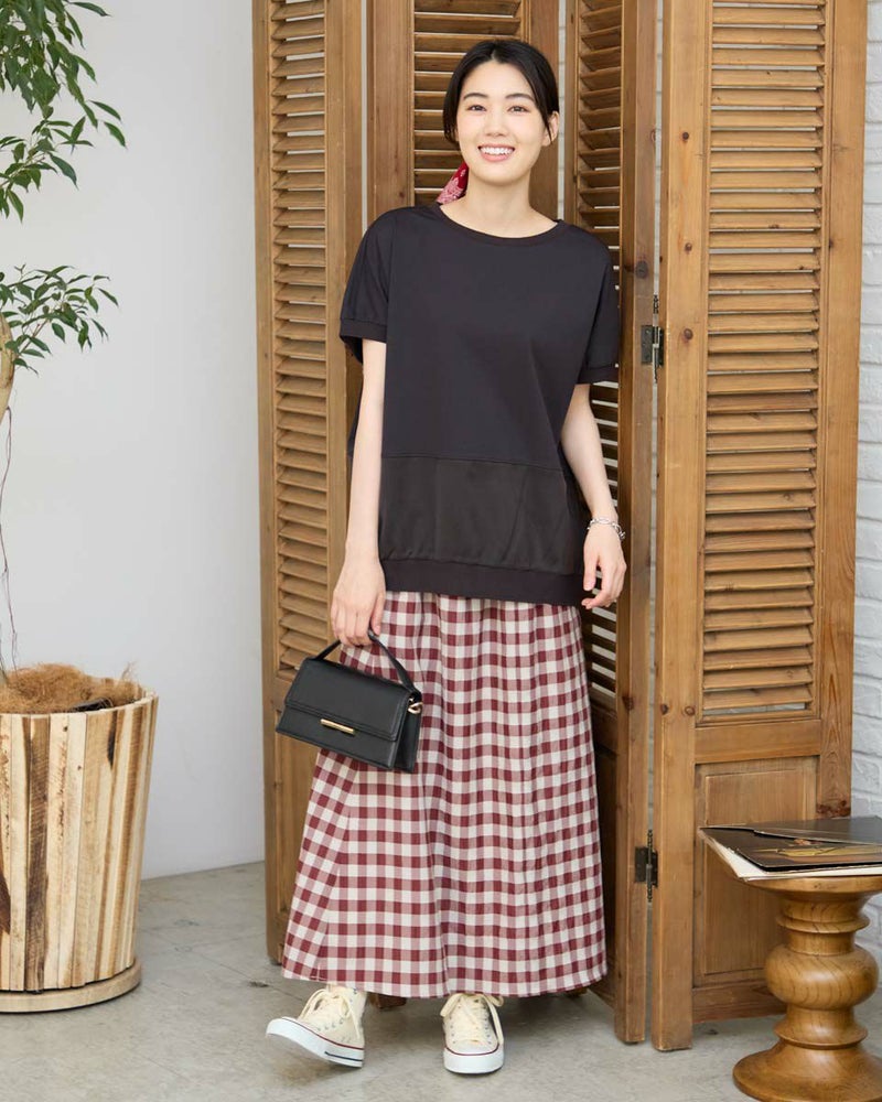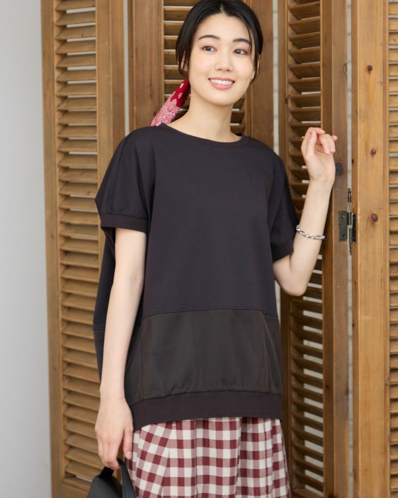 キレイめなポンチを使用した丈長めのトップスです。裾周りにチュールを切り替えてポイントをつけました。ゆったりシルエットと二の腕が隠れる袖丈で、1枚でスタイリングが決まるトップスです。 モデル身長: 166 cm 着用サイズ: M サイズ Golden Bear WOMEN カットソー (WOMEN) 【着用アイテム】467R7313 チェックシャツ 468R6760 チェックスカート
