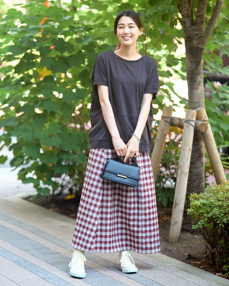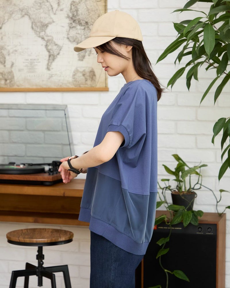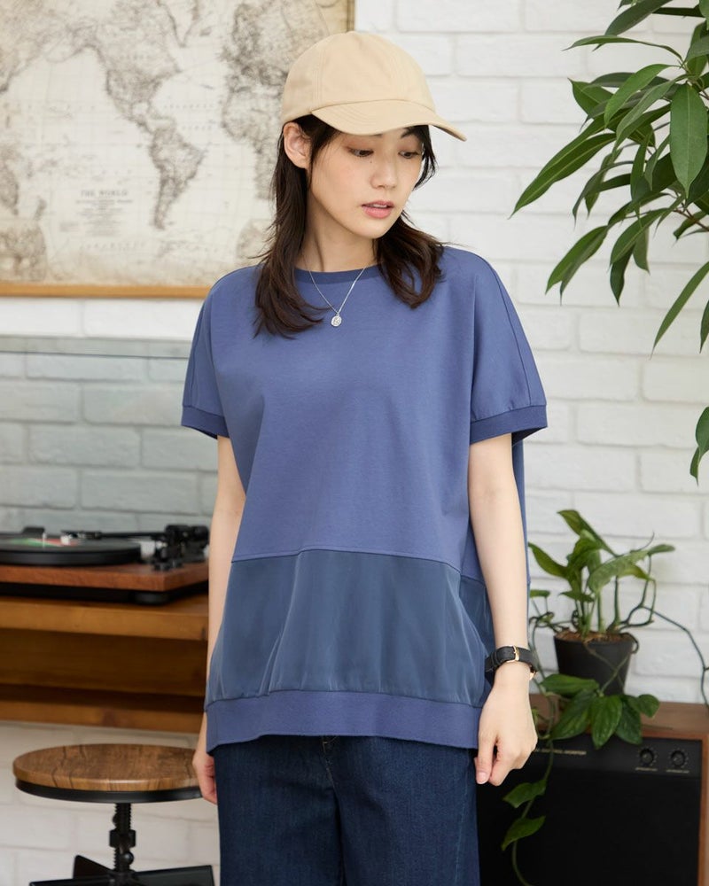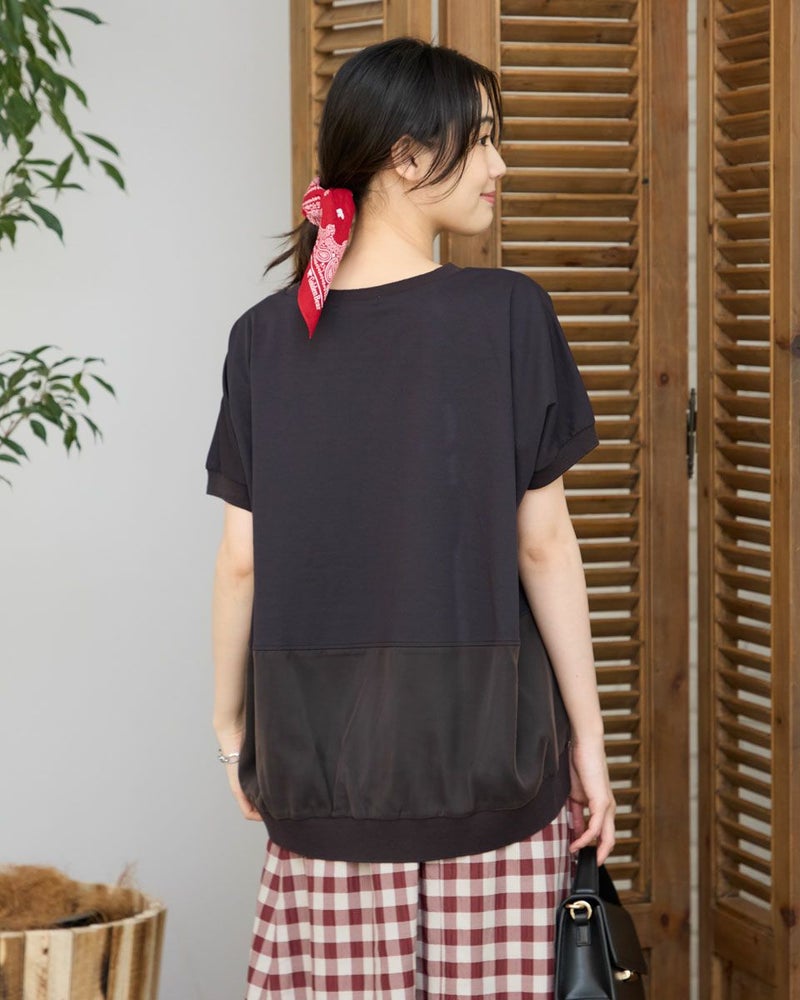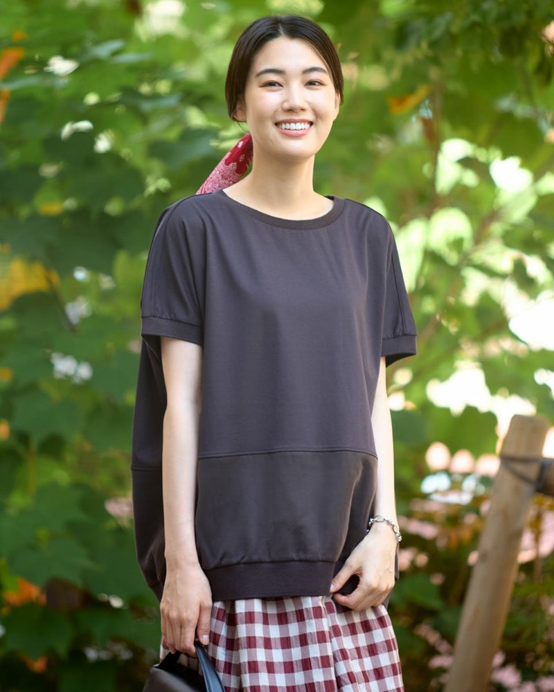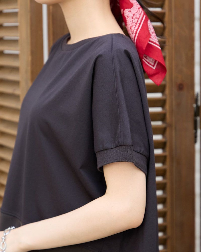 キレイめなポンチを使用した丈長めのトップスです。裾周りにチュールを切り替えてポイントをつけました。ゆったりシルエットと二の腕が隠れる袖丈で、1枚でスタイリングが決まるトップスです。 モデル身長: 166 cm 着用サイズ: M サイズ Golden Bear WOMEN カットソー (WOMEN) 【着用アイテム】467R7313 チェックシャツ 468R6760 チェックスカート