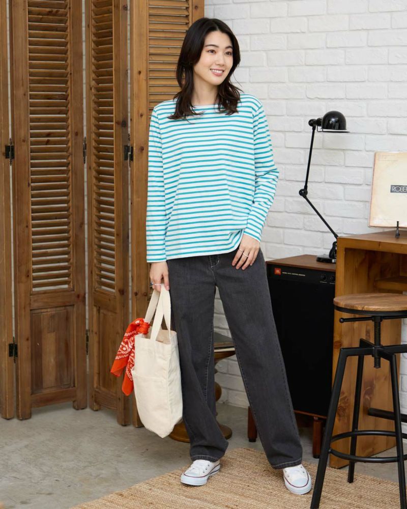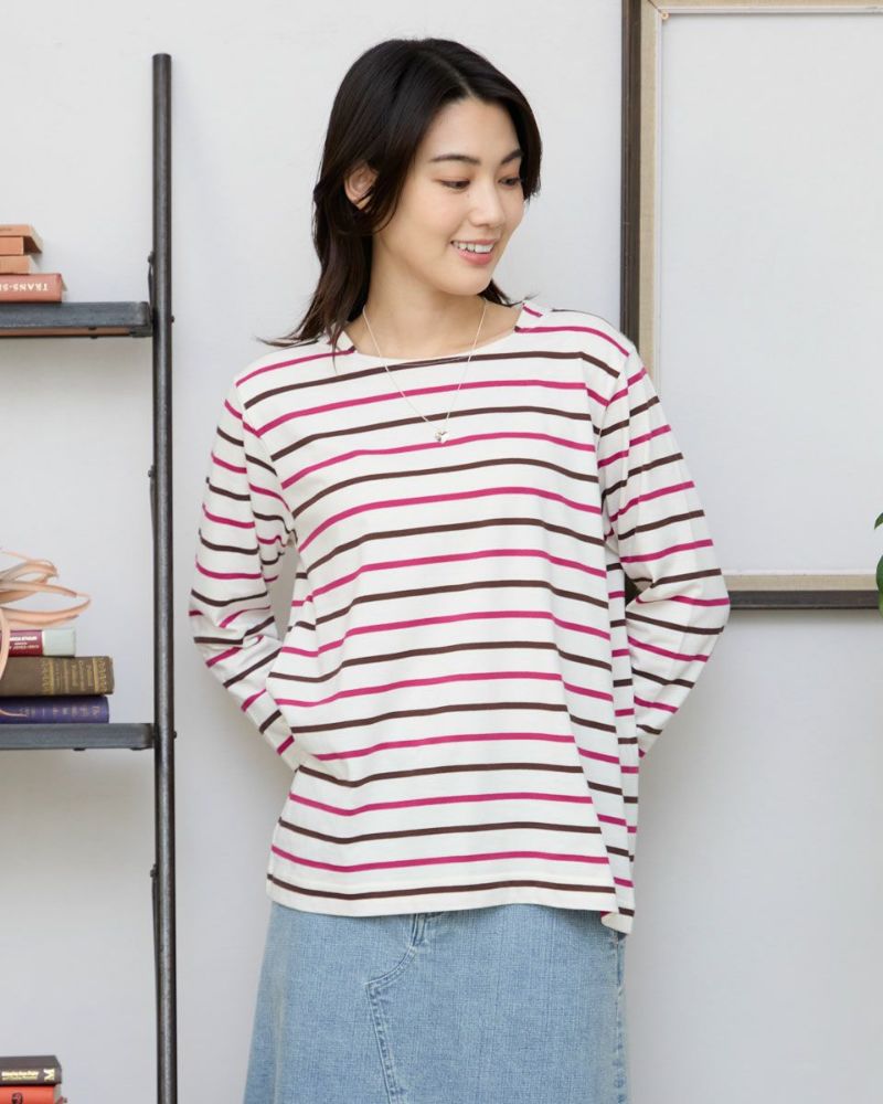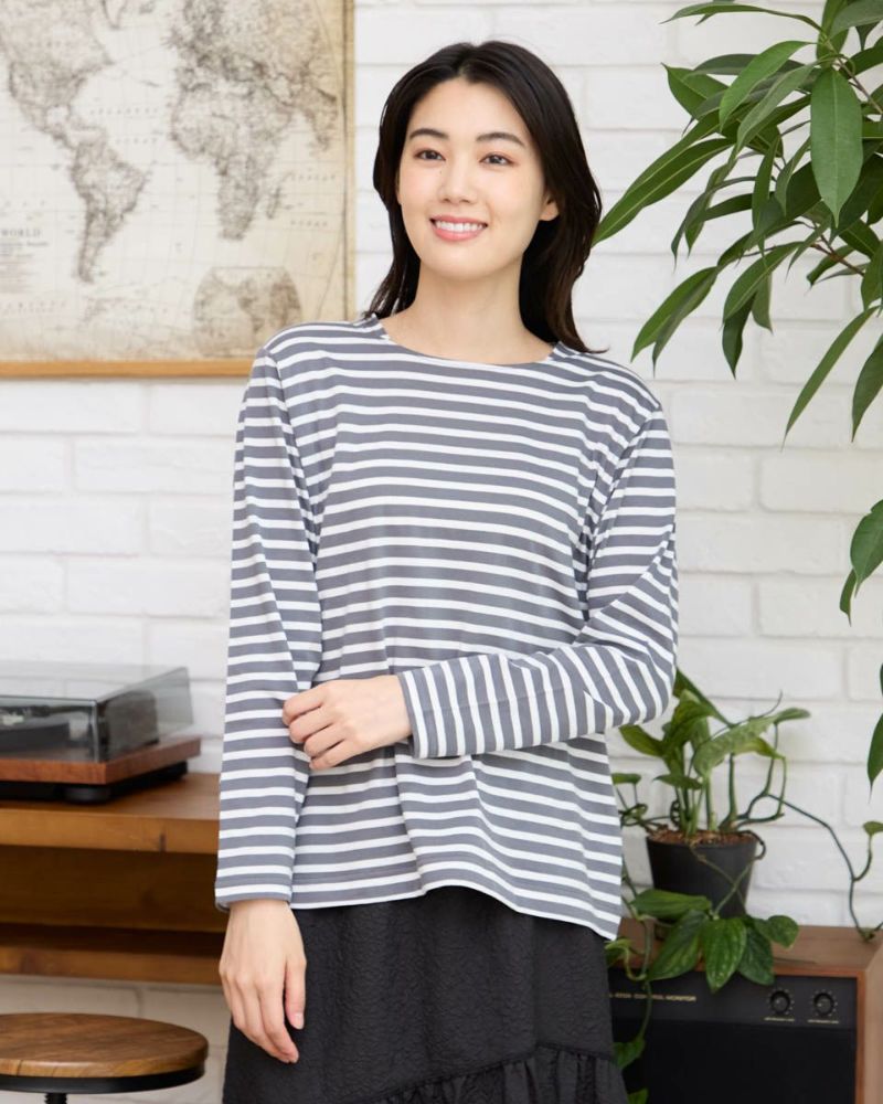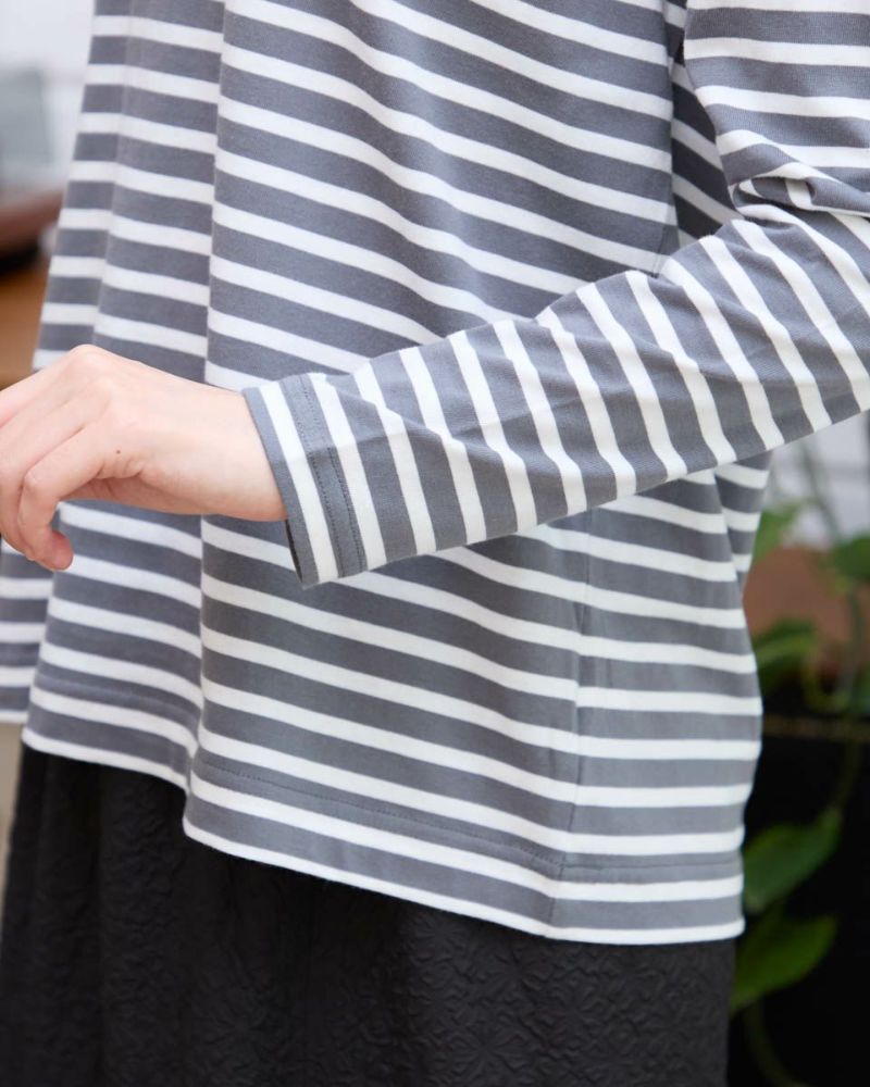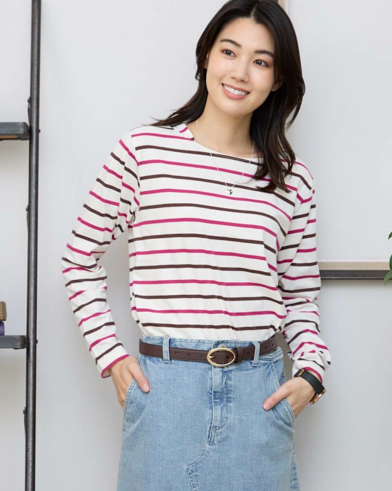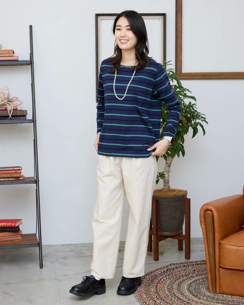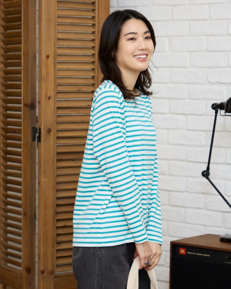 やわらかく扱いやすいTC天竺素材を使った、ボーダー柄の長袖Tシャツ。ベーシックなセットインスリーブで着やすく、1枚でも重ね着でも活躍します。