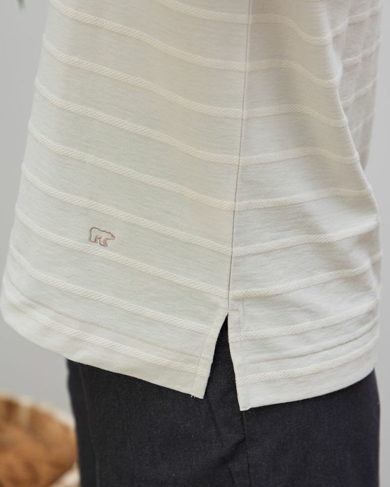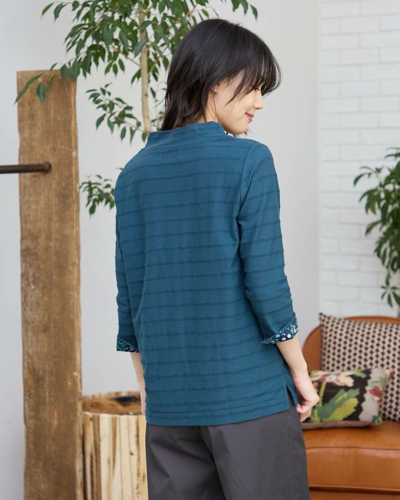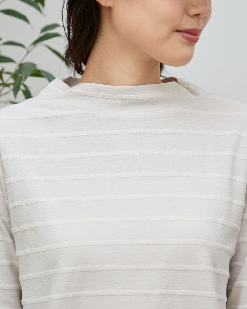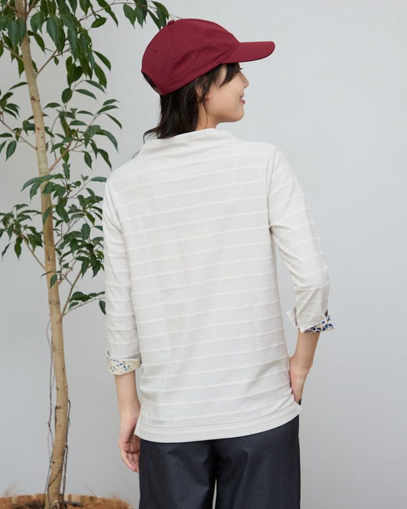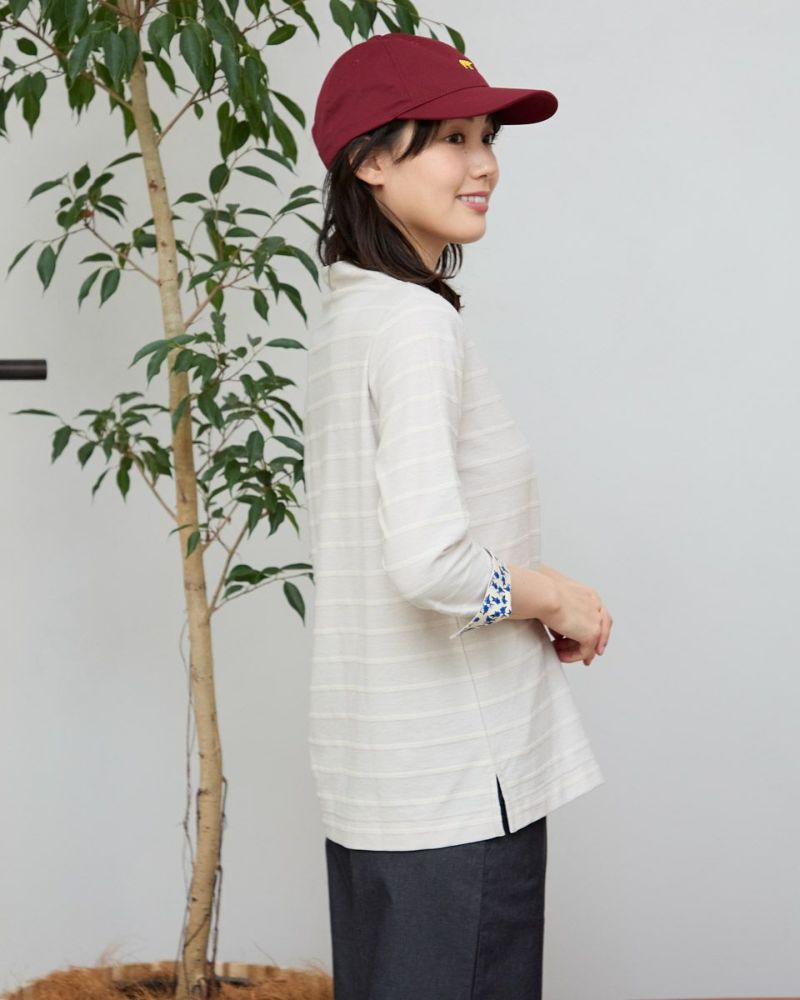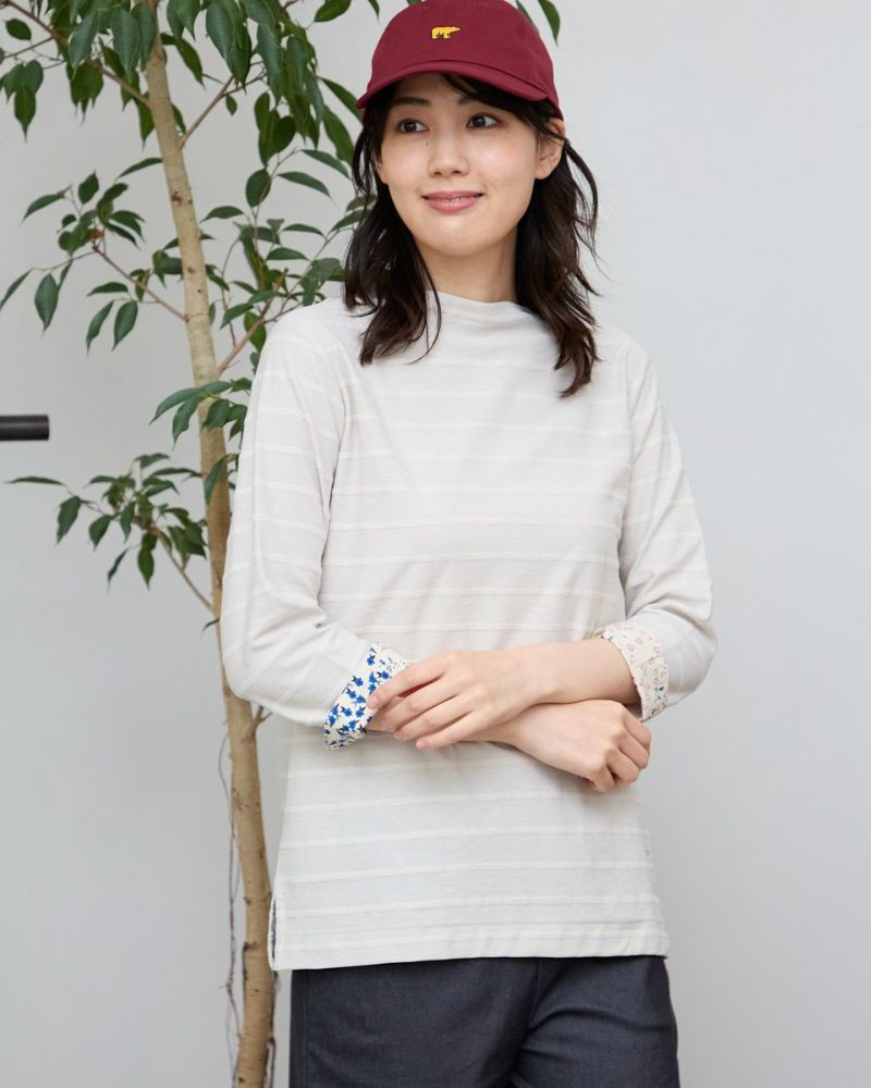 編み柄でボーダーを表現したトップスです。襟が高めなので羽織やカーディガンのインナーとしても使いやすいデザインです。折り返した際に見える袖口裏の花柄がポイントです。 モデル身長: 166 cm 着用サイズ: M サイズ Golden Bear Ladies' カットソー (Ladies') 【着用アイテム】467R8711 ガウチョパンツ 467R8720 ガウチョパンツ