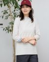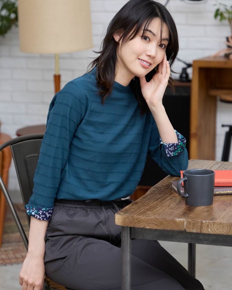編み柄でボーダーを表現したトップスです。襟が高めなので羽織やカーディガンのインナーとしても使いやすいデザインです。折り返した際に見える袖口裏の花柄がポイントです。