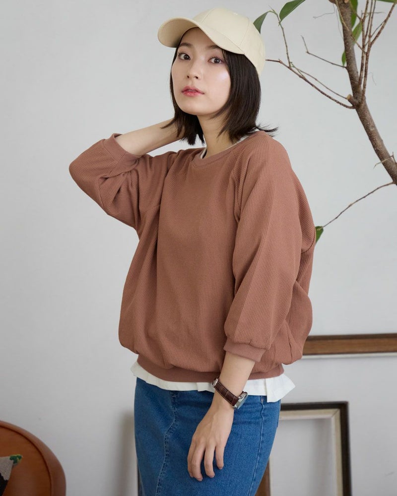 軽くてさらっとしたドライタッチのワッフル素材のTシャツ。5分袖とゆったりしたボリュームシルエットで、動きやすくリラックスした着心地です。肌離れが良く、汗ばむ季節でも快適に過ごせる一枚。 モデル身長: 162 cm 着用サイズ: M サイズ Golden Bear WOMEN カットソー (WOMEN) 【着用アイテム】467RC712 デニムAラインスカート 467R8010 花柄ストール