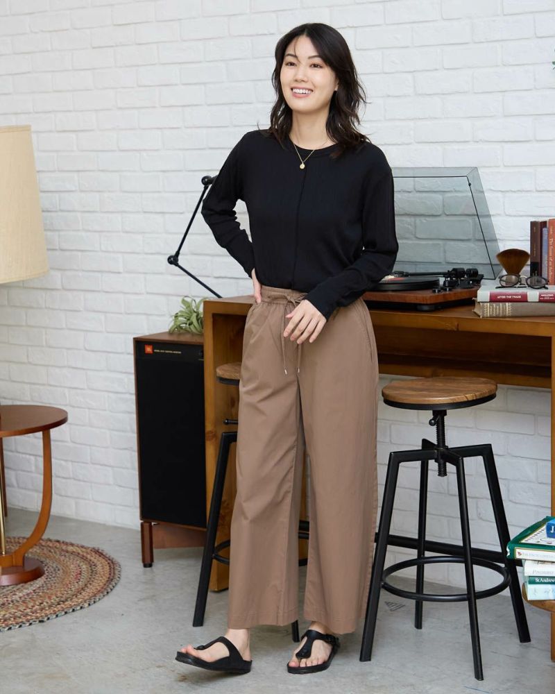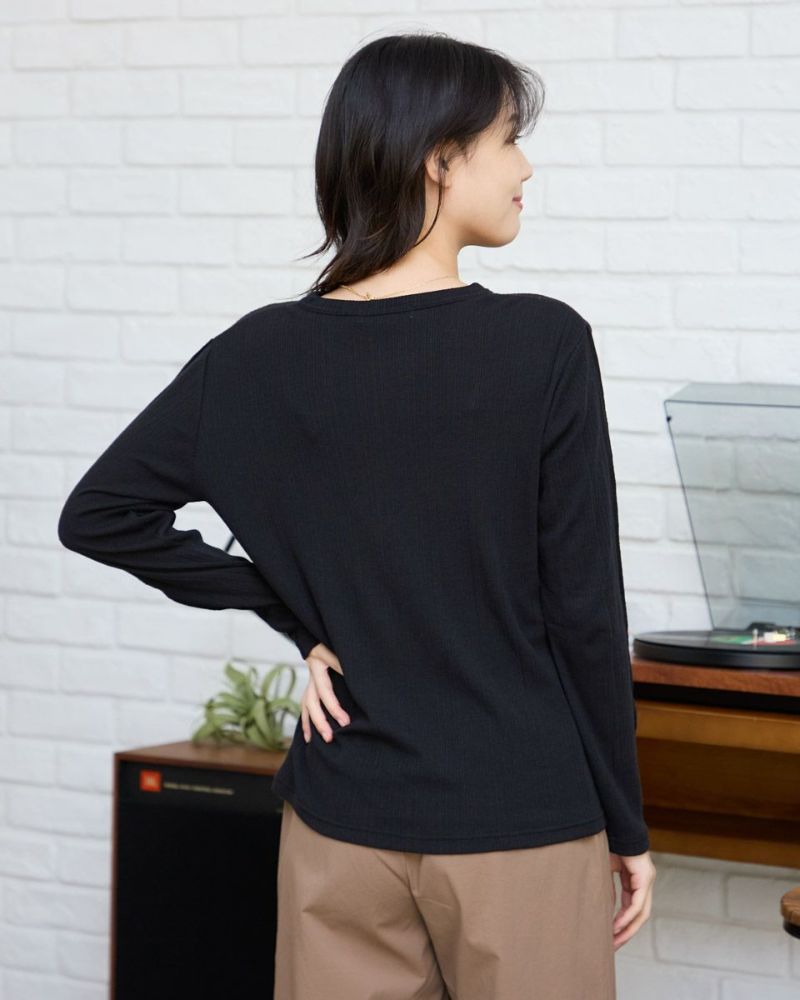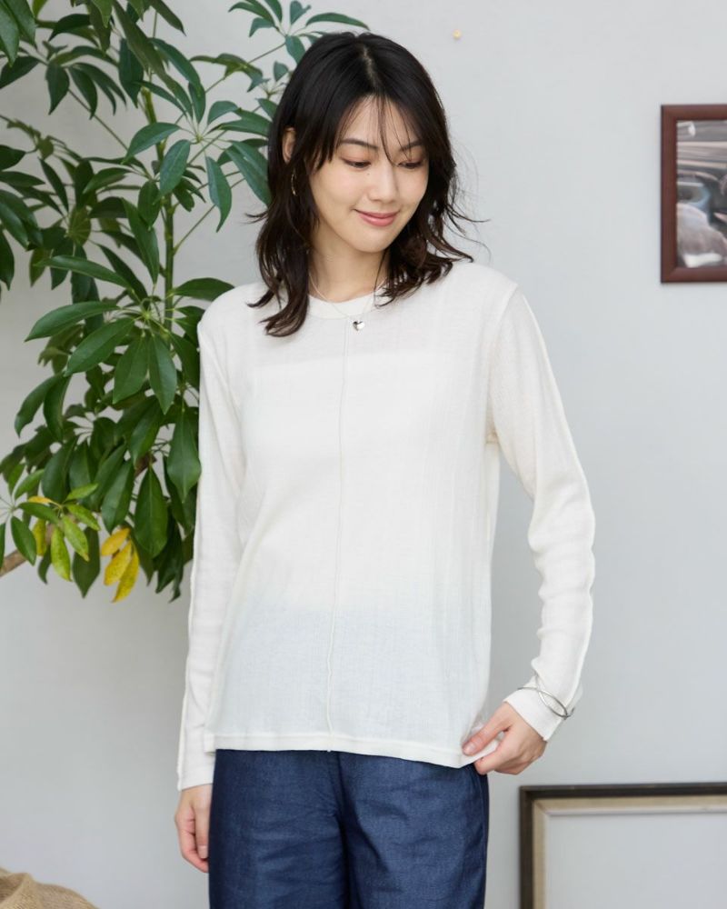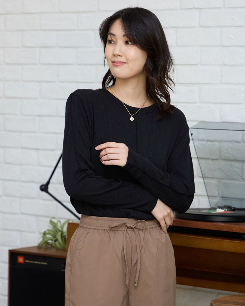 ランダムに針を抜いた薄手のフライスです。伸縮性がありインナーとして着やすい1枚です。フロントと袖にステッチでポイントがついているので1枚でも着やすいトップスです。 モデル身長: 166 cm 着用サイズ: M サイズ Golden Bear Ladies' カットソー (Ladies') 【着用アイテム】467R8711 ガウチョパンツ 467R8720 ガウチョパンツ
