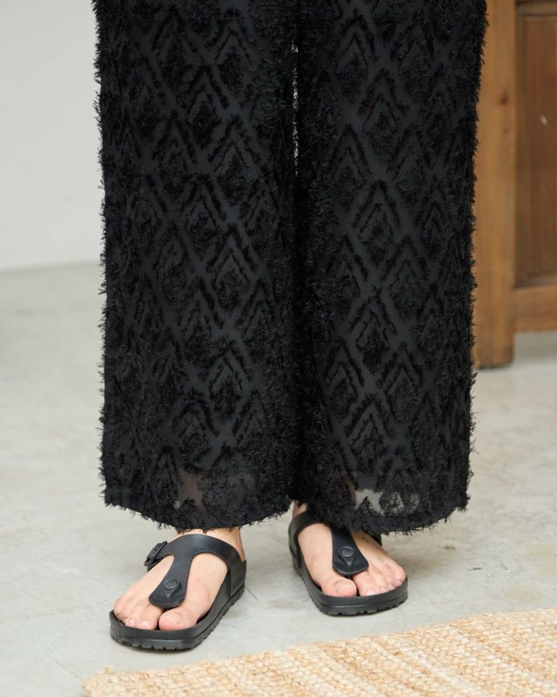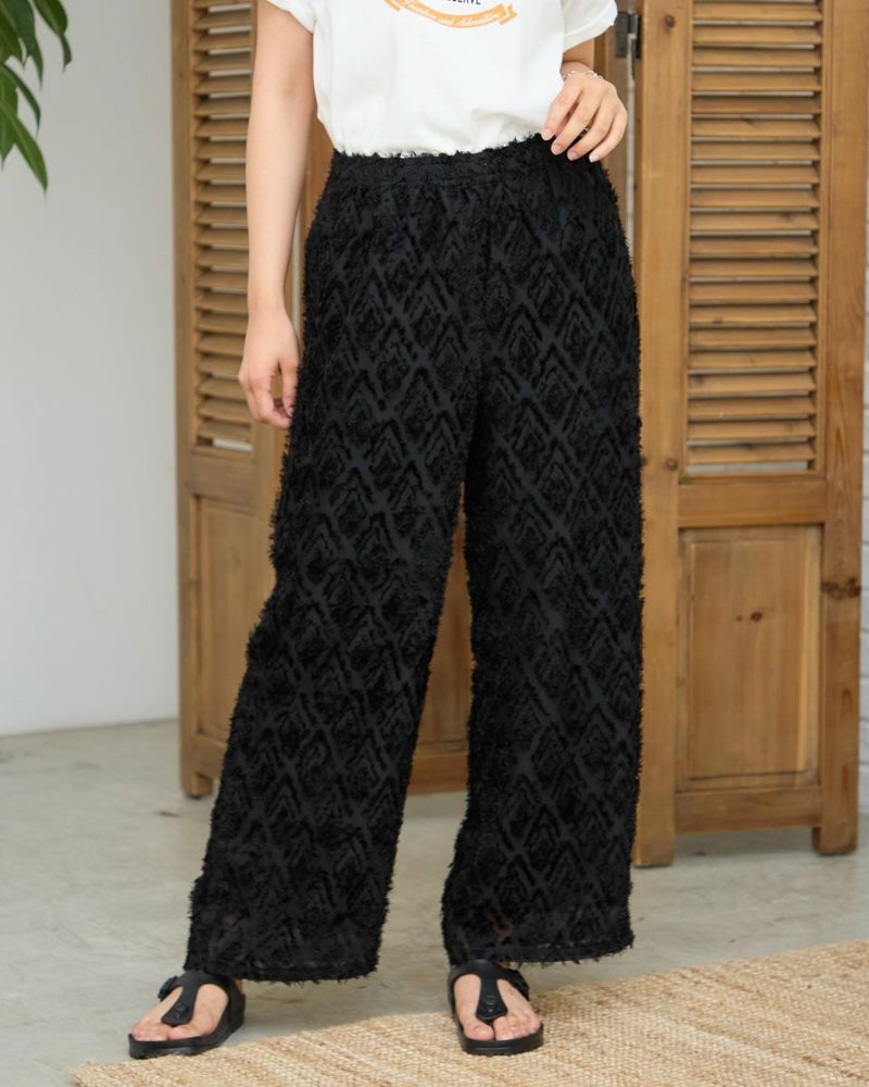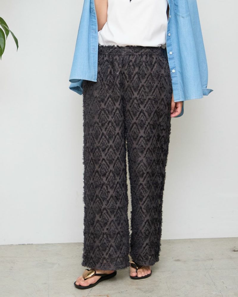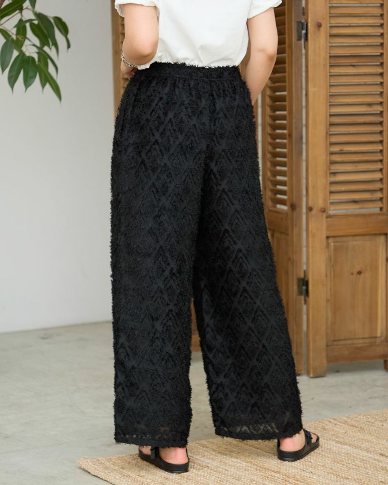ポリエステル100%のカットジャカードを使用したワイドパンツです。ウエストはファスナー無しで総ゴム仕様です。ウエストの内側に杉綾テープを通していて、裏地が付いています。色はブラックとブラウンの2色展開です。
