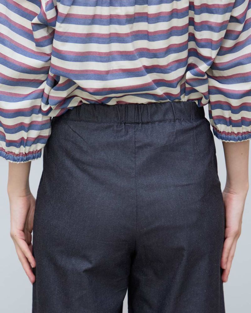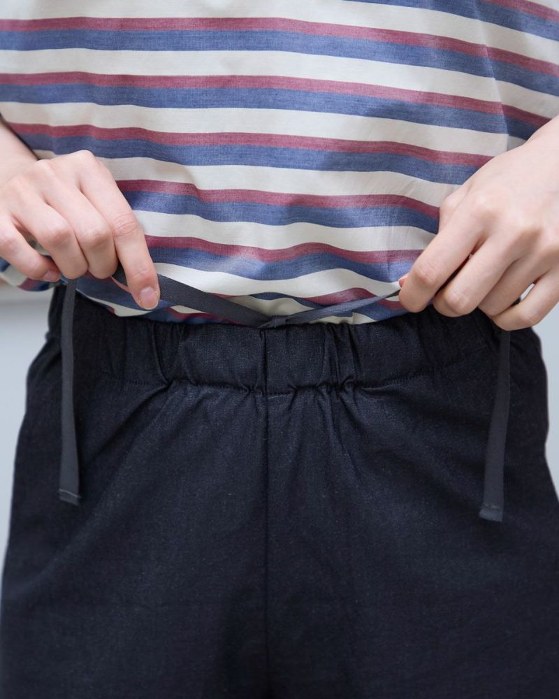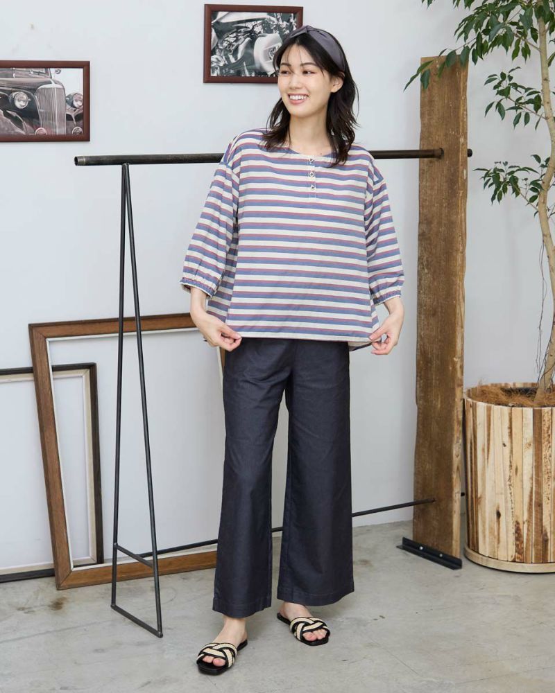 横方向に良く伸びる麻混のハイストレッチ素材を使用したガウチョパンツです。ウエストのベルト切替が無く、お腹周りがスッキリと見える仕様にしています。 モデル身長: 166 cm 着用サイズ: Sサイズ Golden Bear Ladies' ボトムス (Ladies') 【着用アイテム】467R8303 ボーダーブラウス 467R8332 チェックシャツ 467R8601 カーディガン 467R8110 リブ付きシアーブルゾン