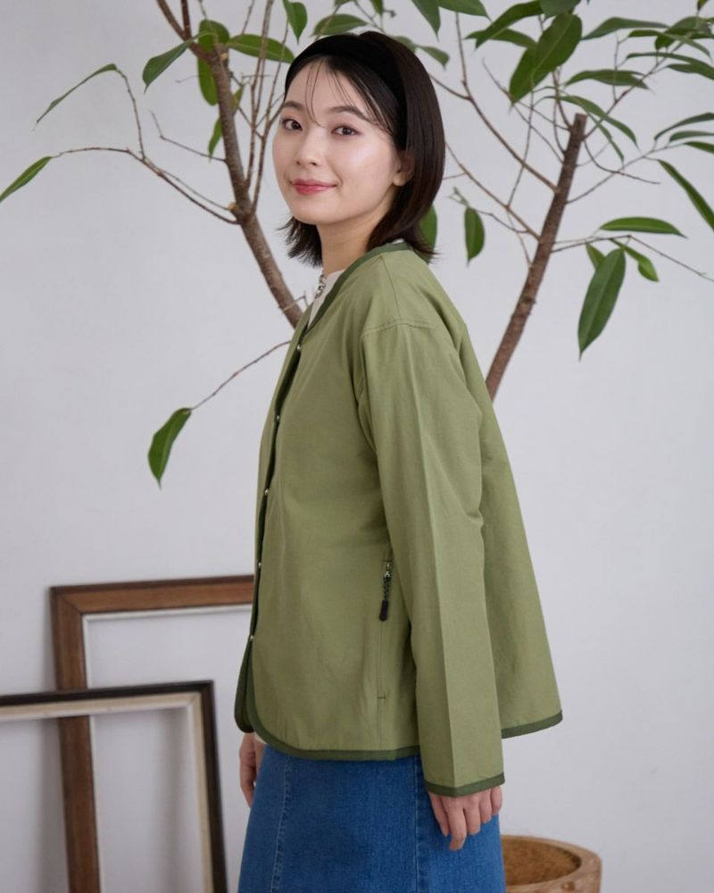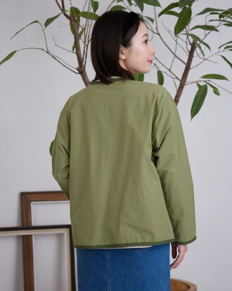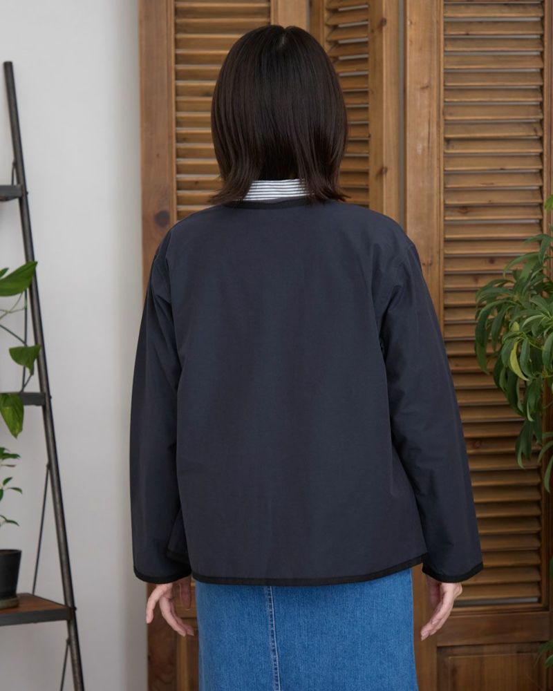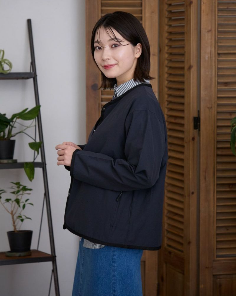 薄手で張りのある素材を使用し、シャツ感覚で着用できるジャケットに仕上げました。レイヤードしやすいVのノーカラーでシャツやTシャツ、パーカなど様々なアイテムとのスタイリングが可能です。パンツの467RC701と同素材で展開しています。