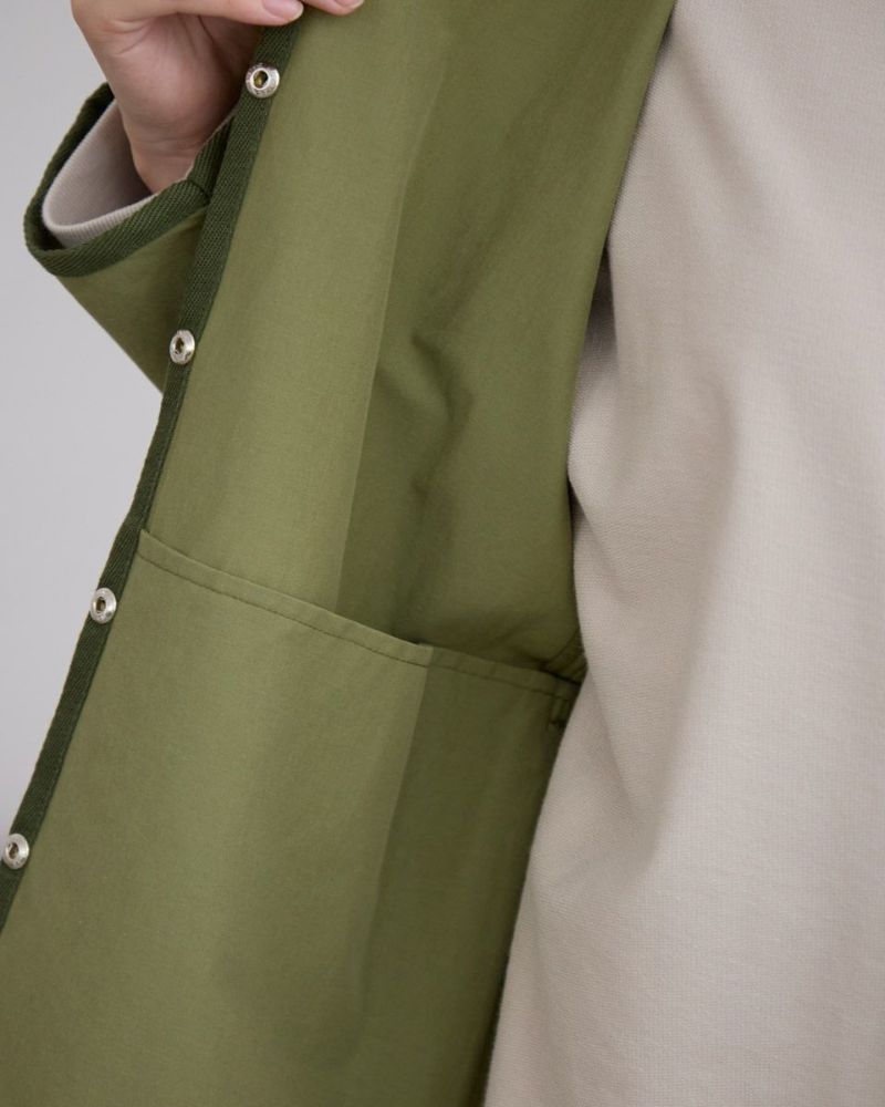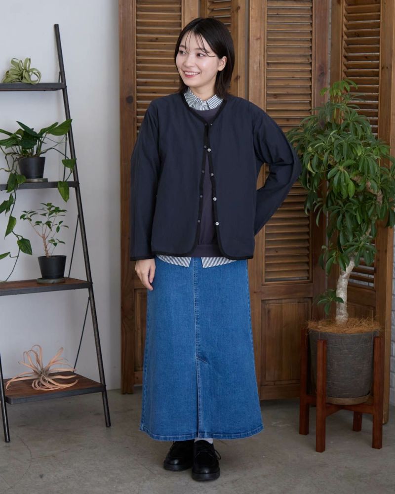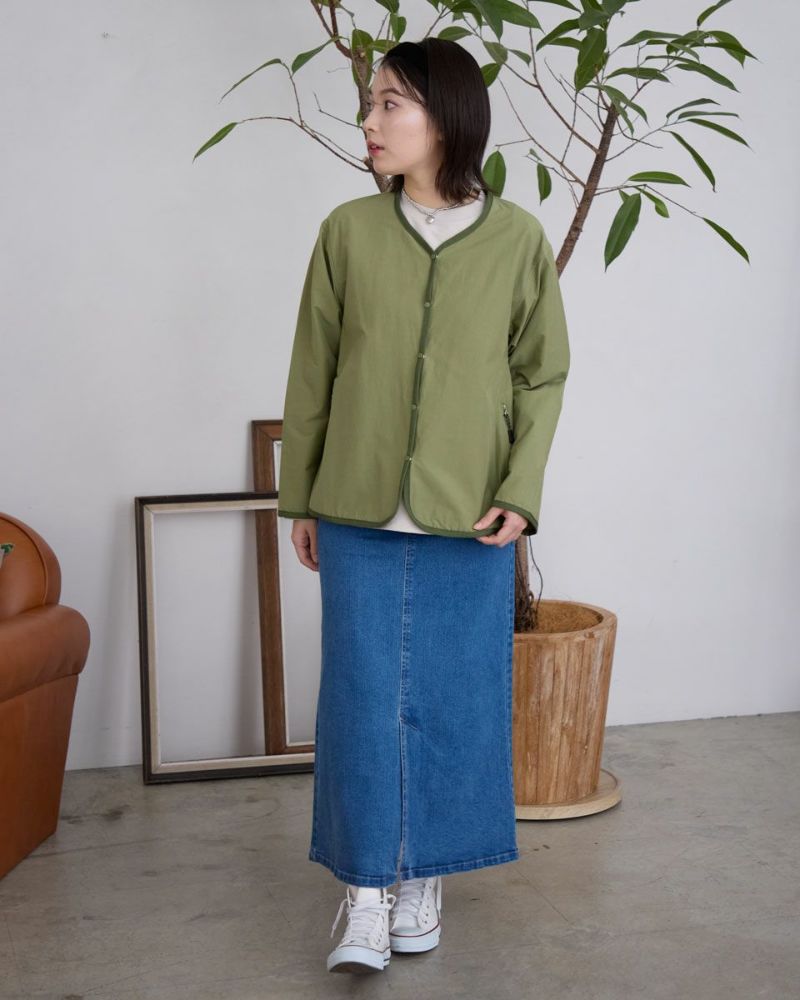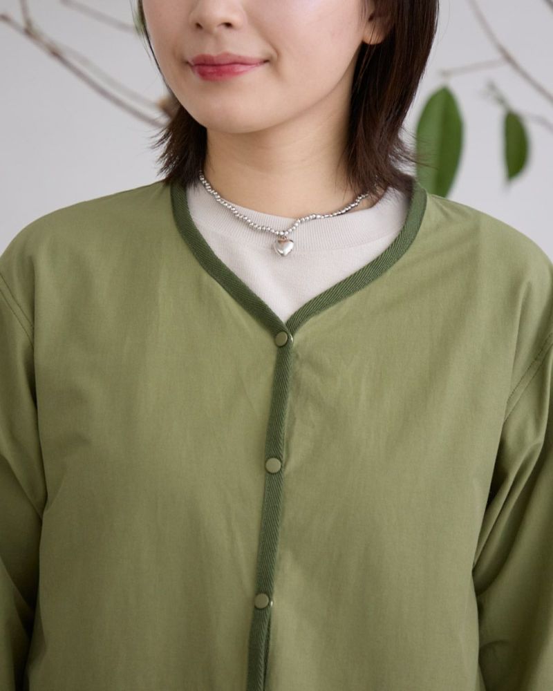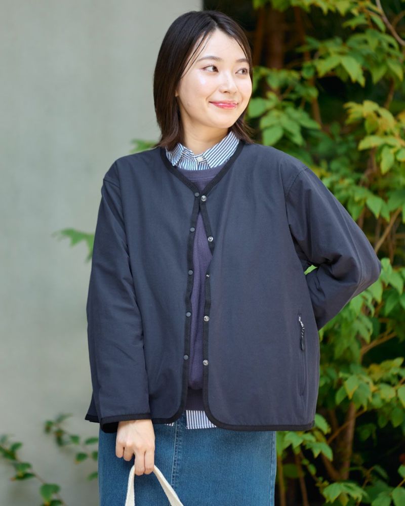 薄手で張りのある素材を使用し、シャツ感覚で着用できるジャケットに仕上げました。レイヤードしやすいVのノーカラーでシャツやTシャツ、パーカなど様々なアイテムとのスタイリングが可能です。パンツの467RC701と同素材で展開しています。