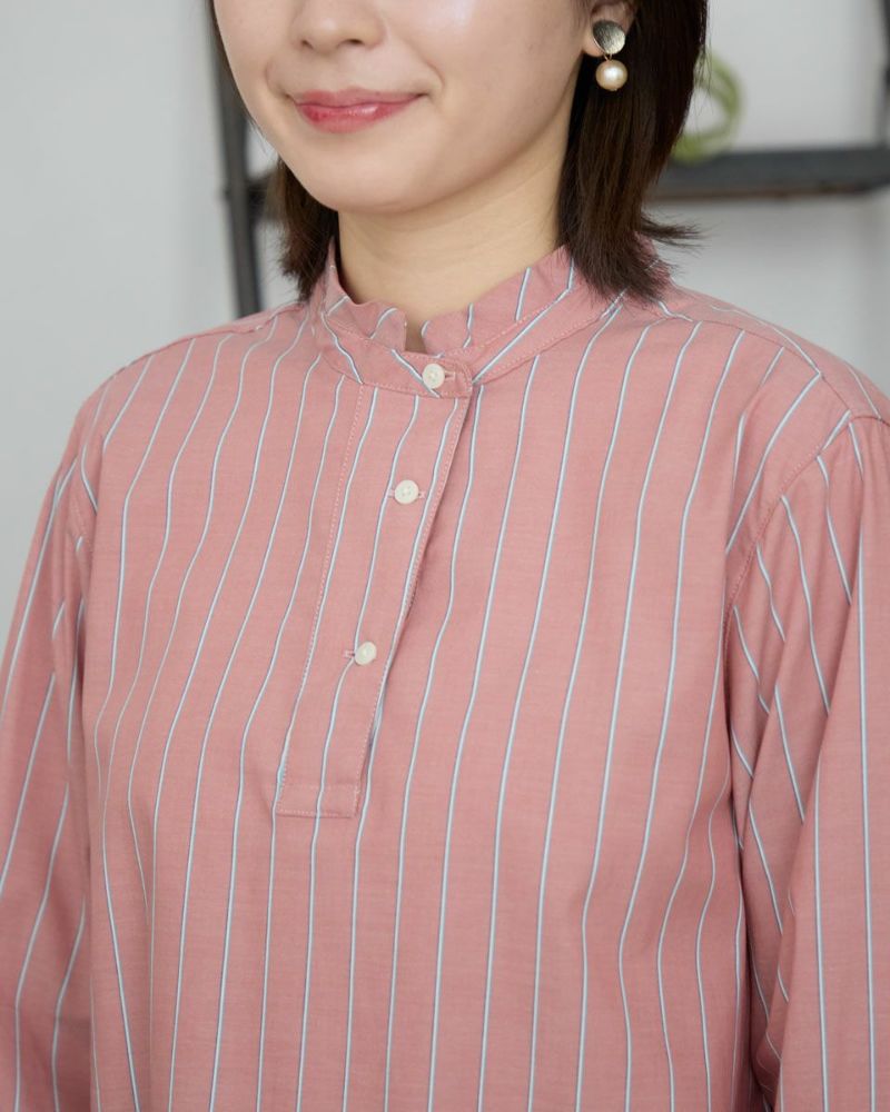 目の詰まったカジュアル過ぎない素材を使用したプルオーバーブラウスです。ひねりの効いたスタンドカラーがすっきりとクリーンな印象です。1枚でシンプルに着用してもサマになる1枚です。 モデル身長: 162 cm 着用サイズ: M サイズ Golden Bear Ladies' ブラウス (Ladies') 同デザイン大きい(3L,4Lサイズ)はこちら 【着用アイテム】467RC711 サイドラインストレートパンツ