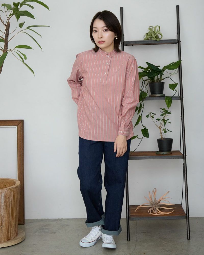目の詰まったカジュアル過ぎない素材を使用したプルオーバーブラウスです。ひねりの効いたスタンドカラーがすっきりとクリーンな印象です。1枚でシンプルに着用してもサマになる1枚です。 モデル身長: 162 cm 着用サイズ: M サイズ Golden Bear Ladies' ブラウス (Ladies') 同デザイン大きい(3L,4Lサイズ)はこちら 【着用アイテム】467RC711 サイドラインストレートパンツ