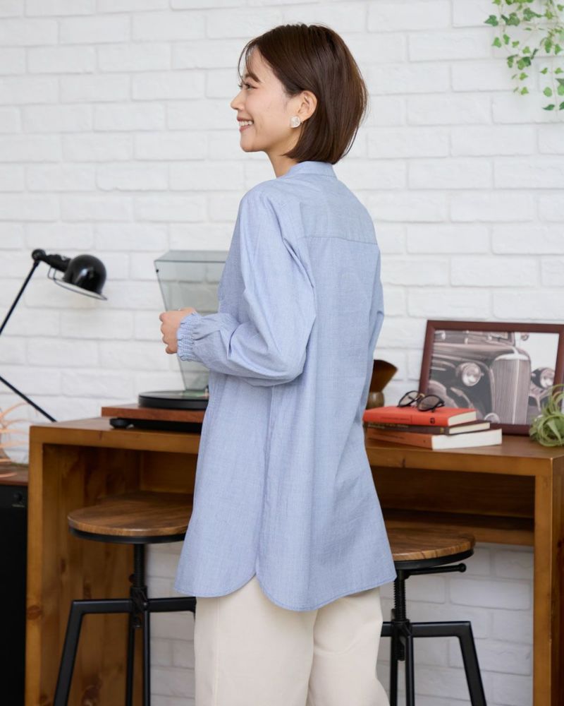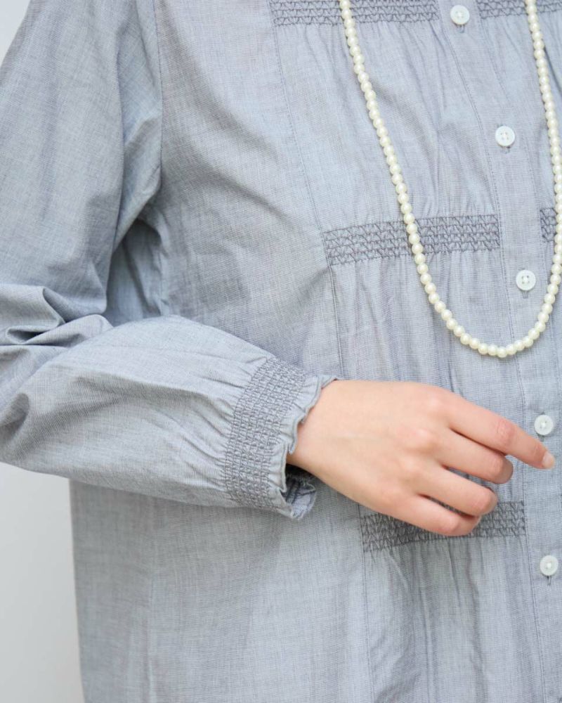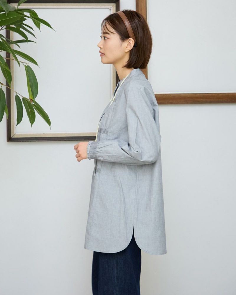 オーガニックコットン100%のシャツチュニックです。前身左右に3本づつと袖口にシャーリング刺繍を入れています。襟は低めのスタンドカラーです。一枚着でも羽織としても着用頂けます。色は2色展開で黒×白とネイビー×白のシャンブレーになります。