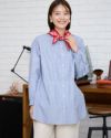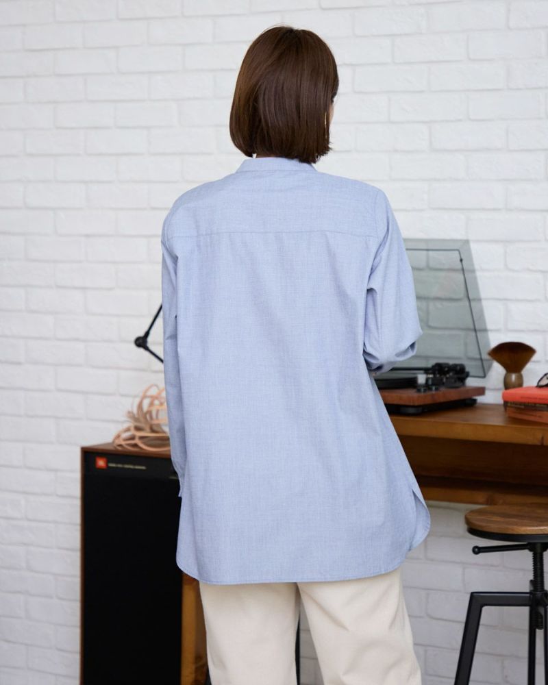 オーガニックコットン100%のシャツチュニックです。前身左右に3本づつと袖口にシャーリング刺繍を入れています。襟は低めのスタンドカラーです。一枚着でも羽織としても着用頂けます。色は2色展開で黒×白とネイビー×白のシャンブレーになります。