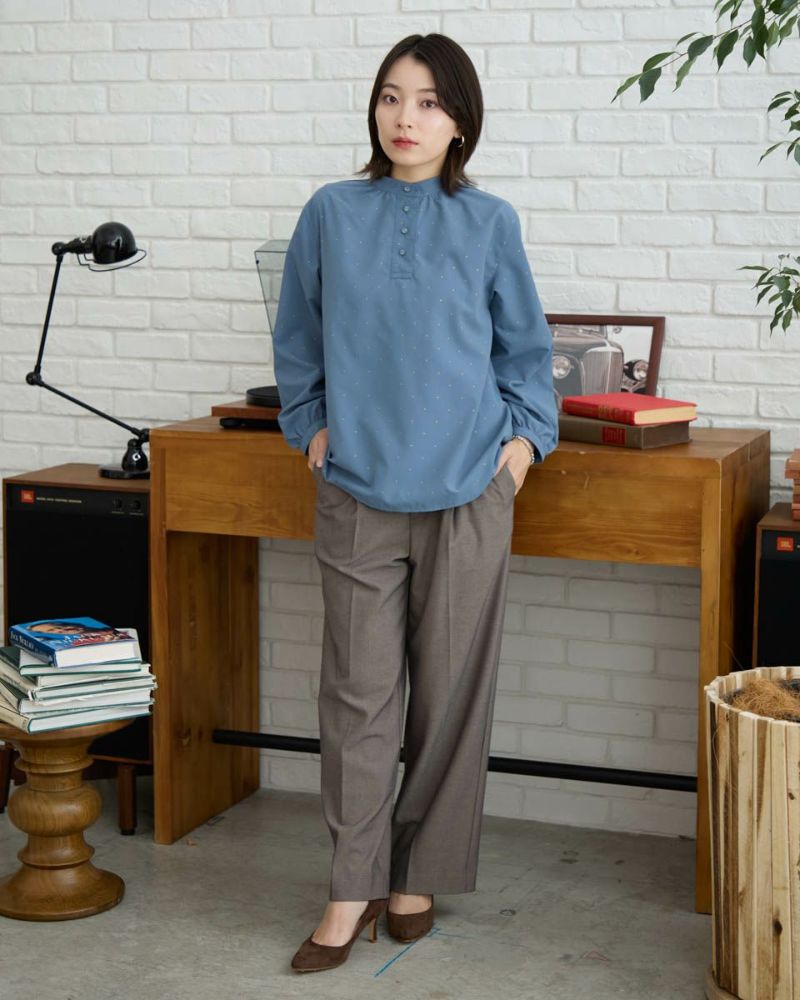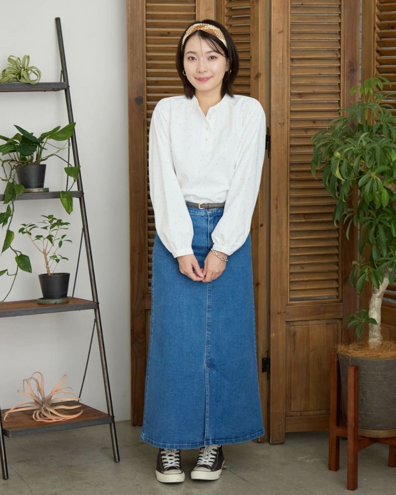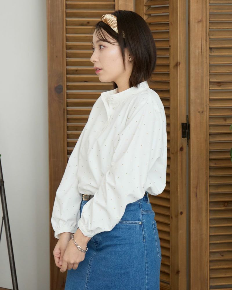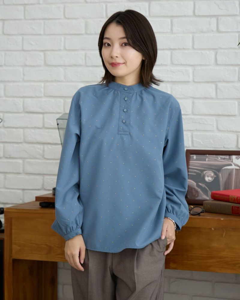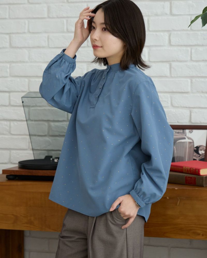 グリッターのラメドットがさりげなくも華やかな印象のブラウスです。ステッチを効かせた襟と前立てがデザインのポイントです。Aラインシルエットで女性らしさを演出します。 モデル身長: 162 cm 着用サイズ: M サイズ Golden Bear Ladies' ブラウス (Ladies') 【着用アイテム】467RC712 デニムAラインスカート