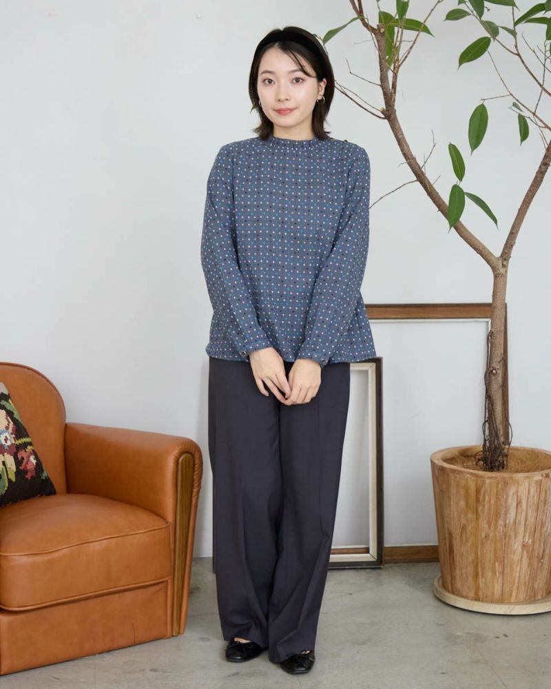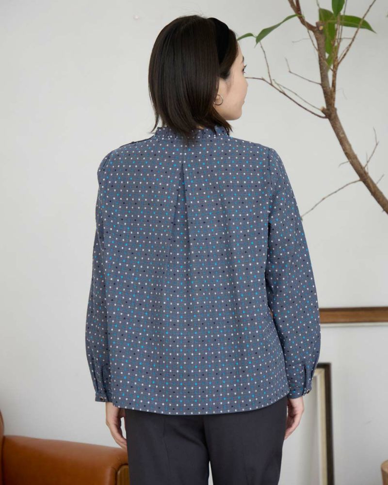 クラシカルな印象を引き立てる千鳥格子柄に、フリルの襟元が映えるブラウス。被り仕様ですが襟元のボタンで着脱もスムーズ。甘すぎない柄とディテールで上品な一枚です。ジャケットやカーディガンのインナーとしても映える、着まわしのきくアイテムです。