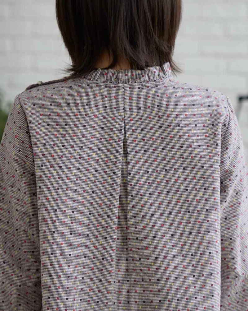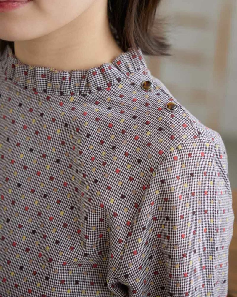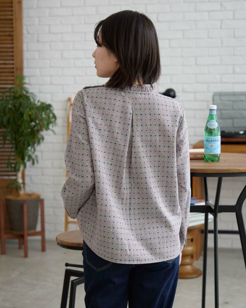 クラシカルな印象を引き立てる千鳥格子柄に、フリルの襟元が映えるブラウス。被り仕様ですが襟元のボタンで着脱もスムーズ。甘すぎない柄とディテールで上品な一枚です。ジャケットやカーディガンのインナーとしても映える、着まわしのきくアイテムです。