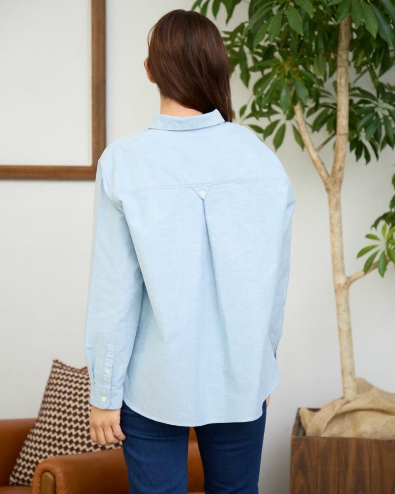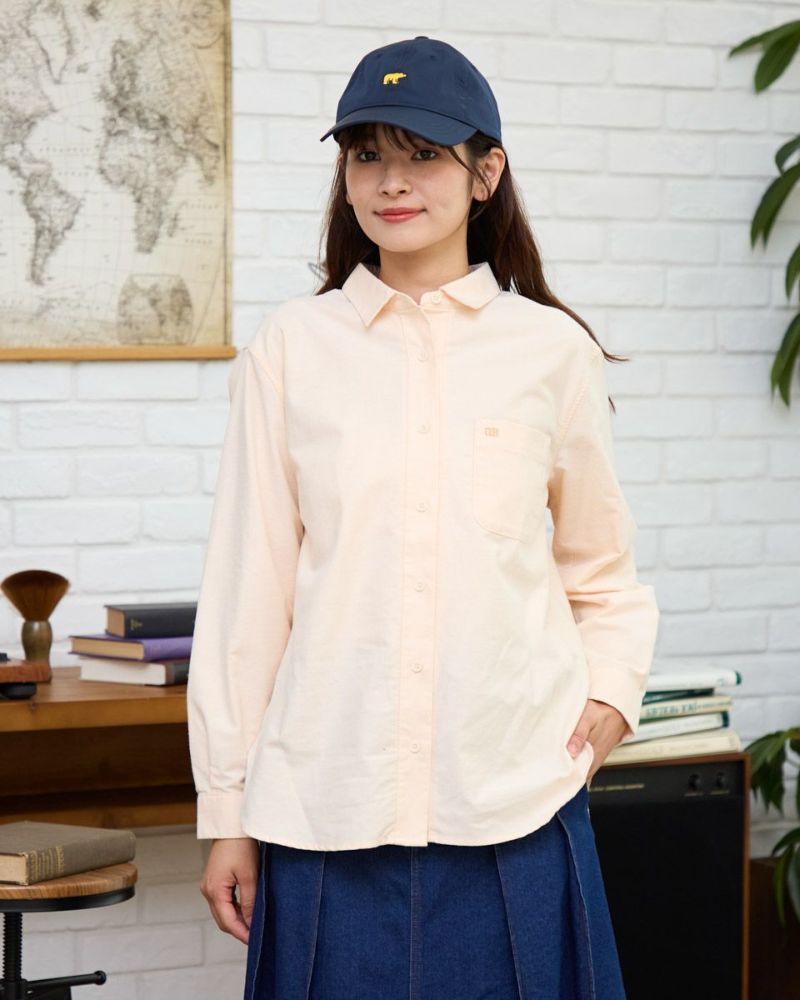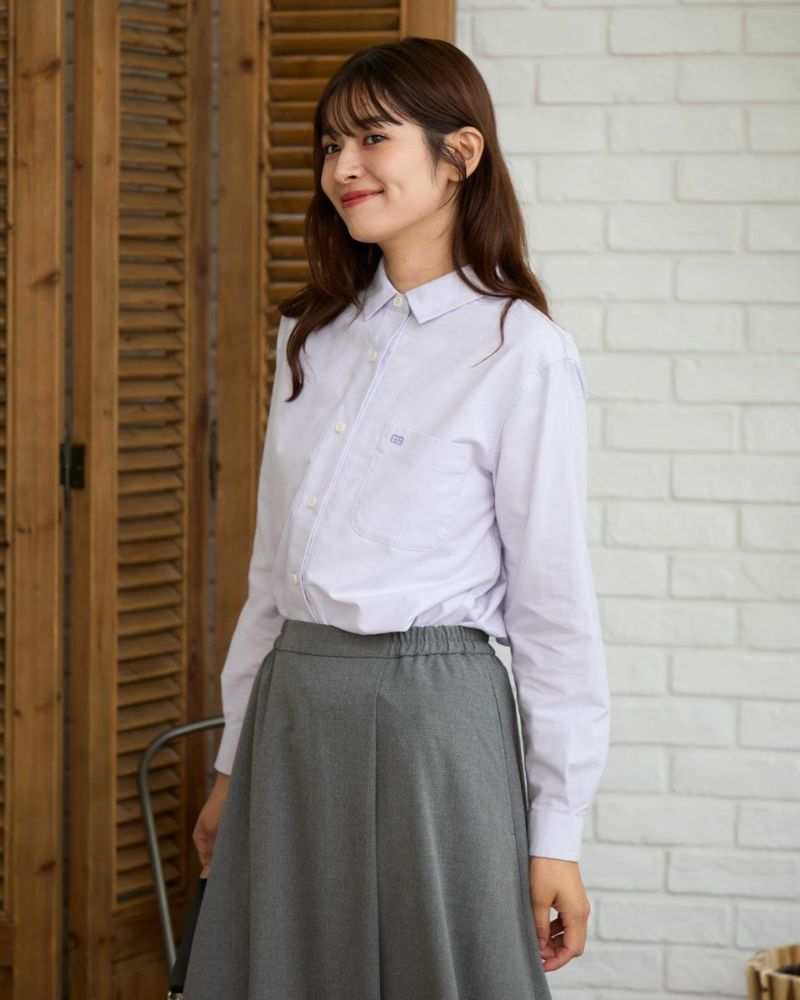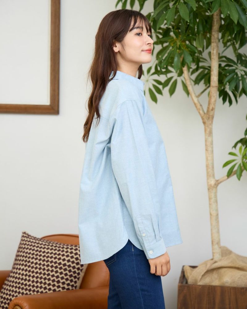 柔らかなカラーリングのオックス素材のシャツです。重くなりがちな秋冬のコーディネートのアクセントになります。襟と前たてにステッチを入れず堅苦しくならないように仕上げました。さりげないGB刺繍もポイントです。