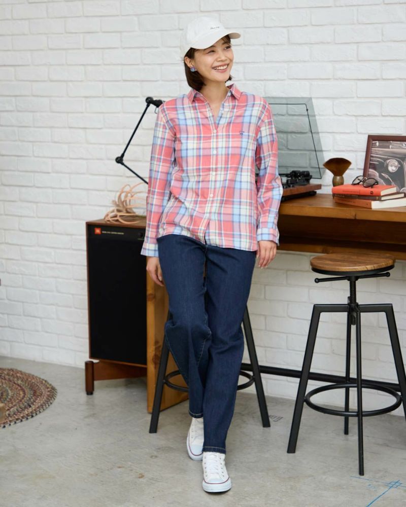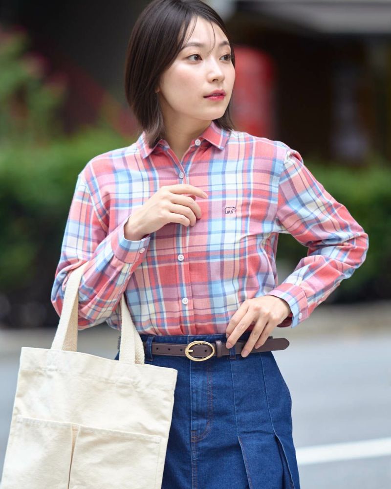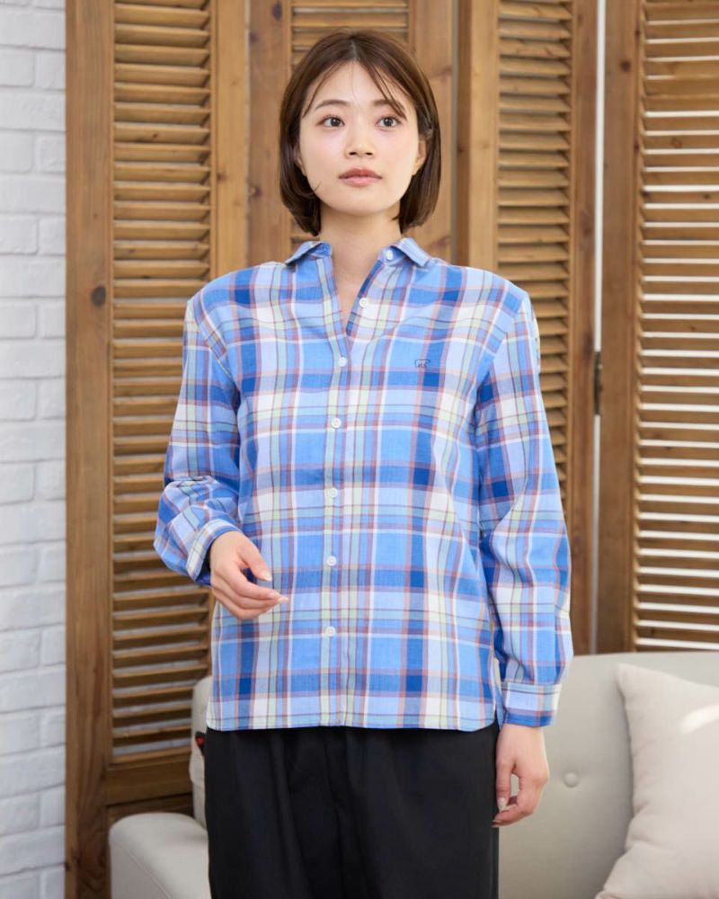 ビンテージのような表情に仕上げたレギュラーカラーのチェックシャツです。ゴールデンベアらしい色を効かせた配色で胸にアイコンのクマ刺繍を配置しています。メンズと共通素材、カラーで展開しています。
