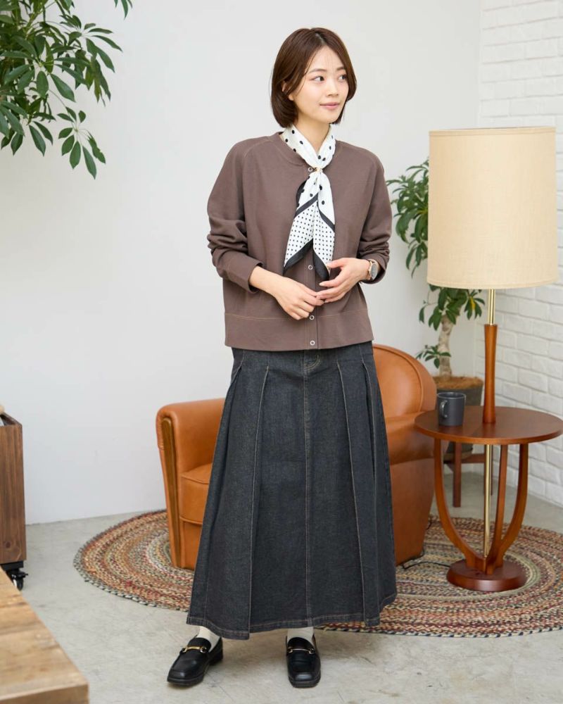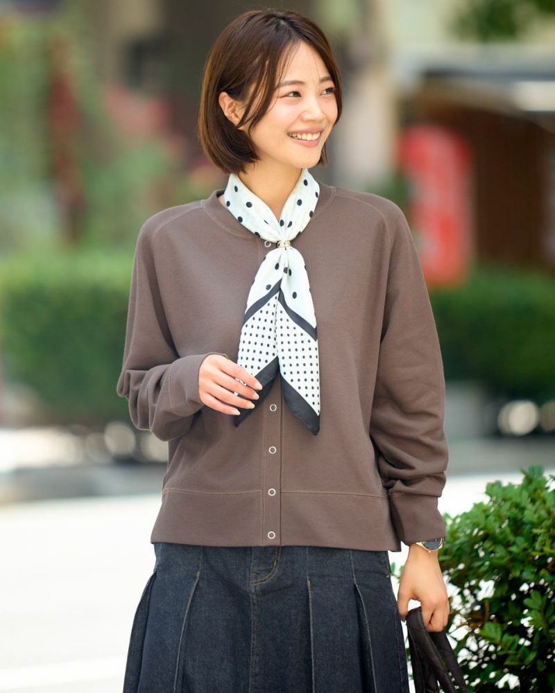 カットソー素材ながら、程よくしっかりとした肉感で仕立てたカーディガン。カジュアルすぎず、ジャケットのような感覚で羽織れる一枚です。リングドットボタンがさりげないアクセントとなり、洗練された印象に。アイボリーとモカの落ち着いた2色展開で、きれいめからカジュアルスタイルまで幅広く活躍します。