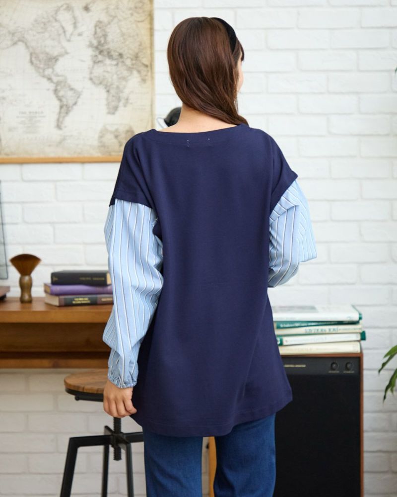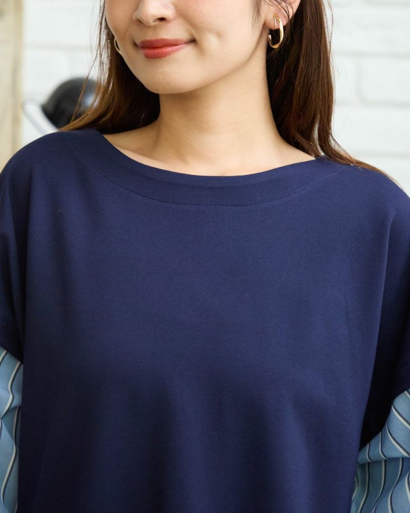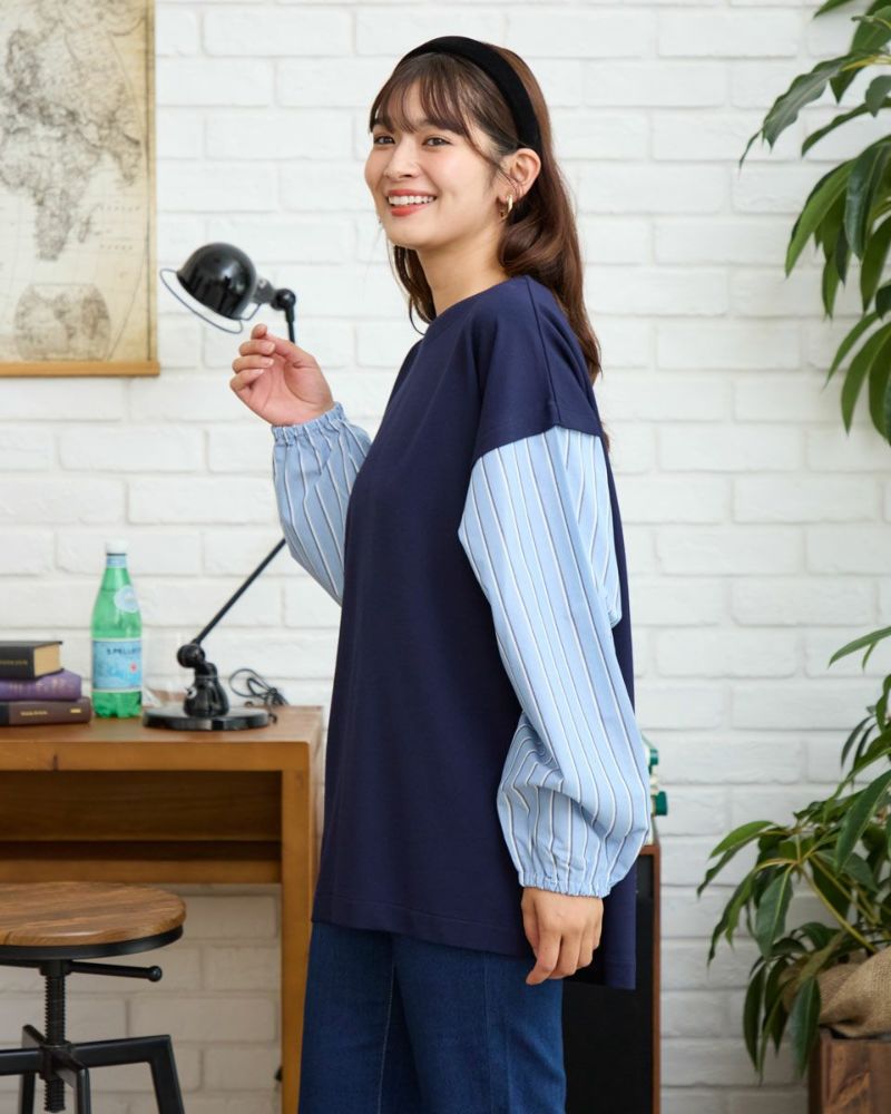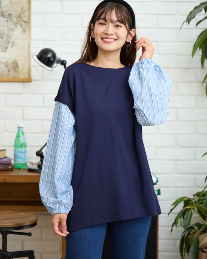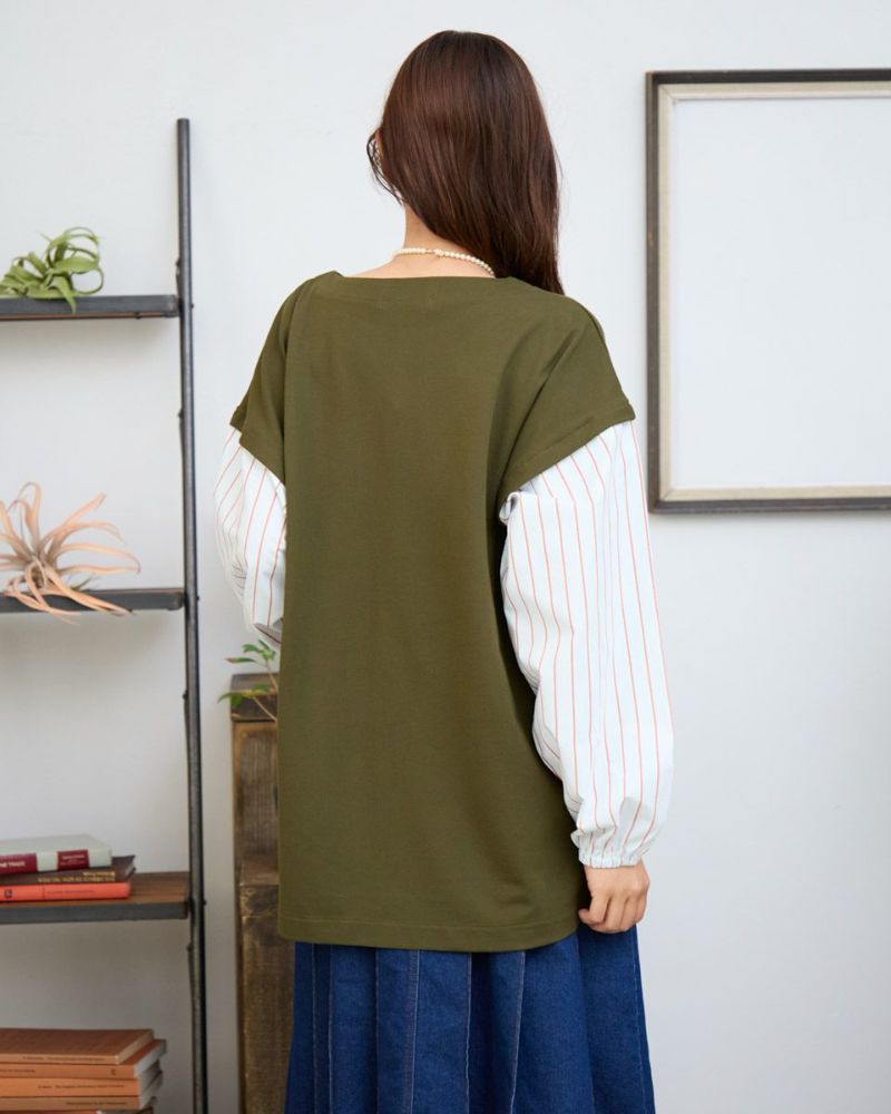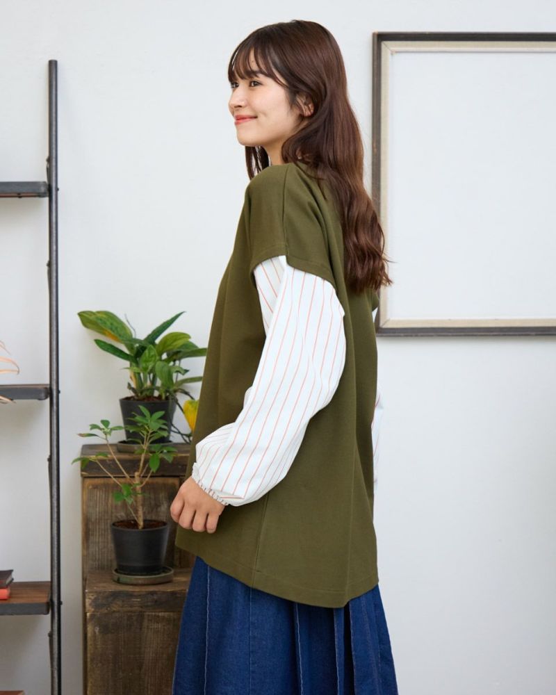 重ね着をしているようなデザインのトップスです。表面がきれいなポンチ素材とシャツ地のコンビで楽ちんなのにきちんと見えます。袖口はゴムでたくしあげやすい仕様にしています。
