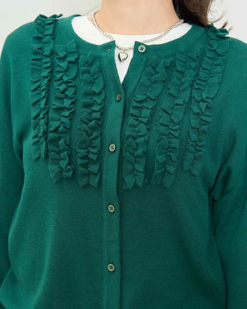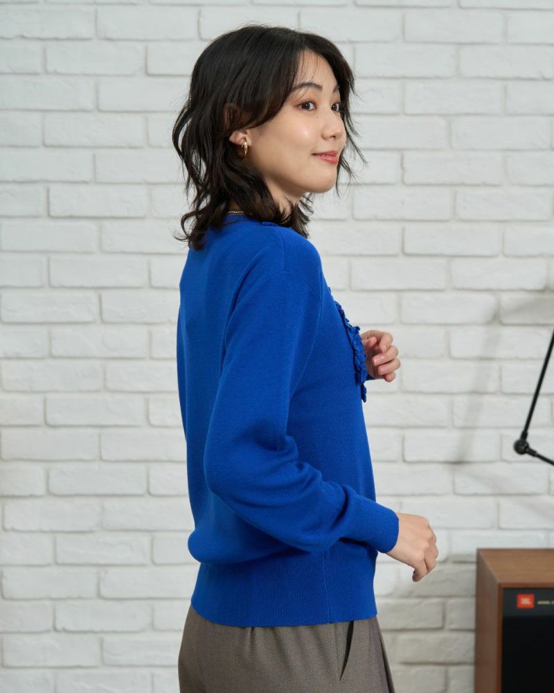 胸元にあしらったフリルがシンプルなカーディガンに彩りをプラス。少し膨らみのある編み地で1枚で着こなせるよう仕上げました。デニムやカジュアルアイテムと合わせるのがおすすめです。