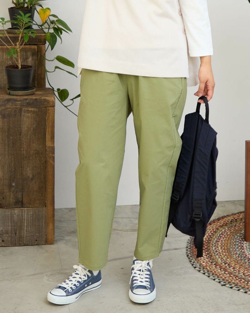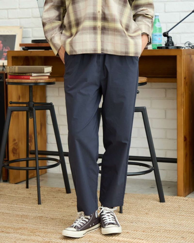 467RC102とセットアップで着用いただけるJKと同素材のパンツです。ストレッチ素材とゆとりを出したシルエットでストレスフリーに着用いただけます。ウエストゴム仕様で楽ちんなパンツです。