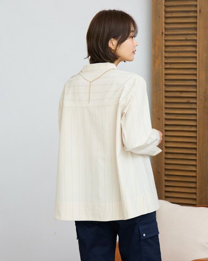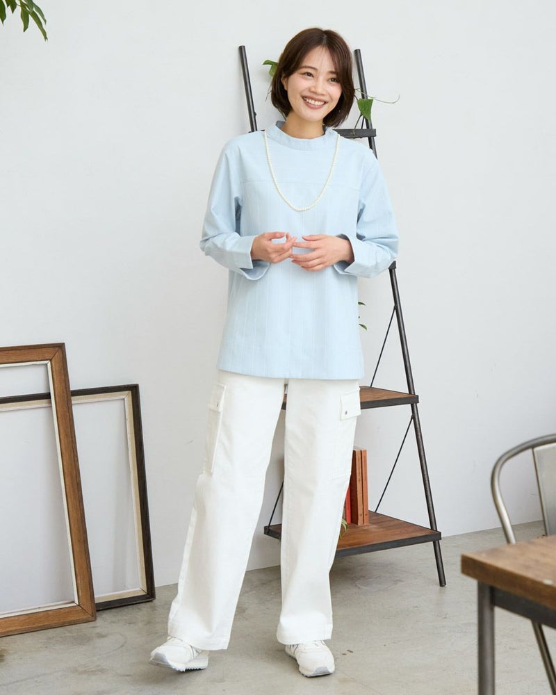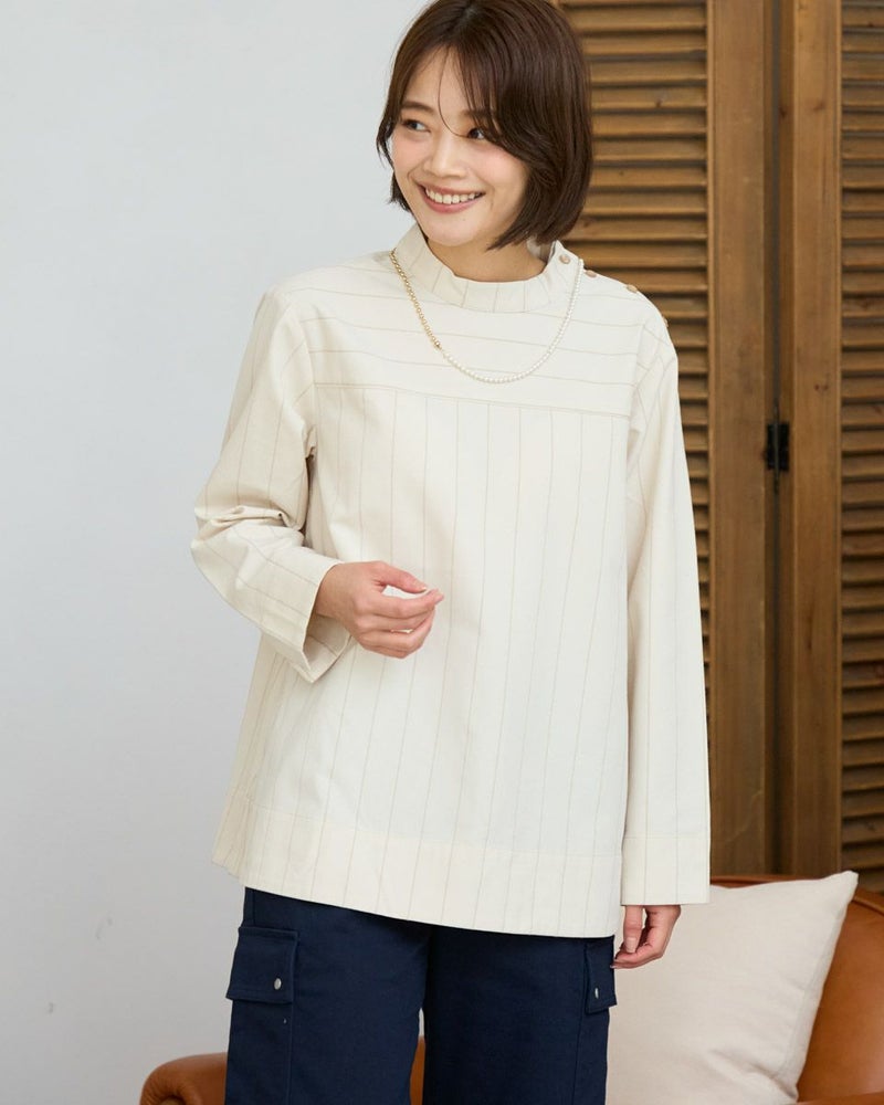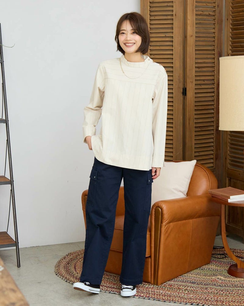 立体感のある微配色ストライプ柄が特徴のかぶりブラウスです。袖口はスリットを入れることで折り返し易い仕様です。女性らしいフレアシルエットはテーパードパンツと相性が抜群です。 モデル身長: 167 cm 着用サイズ: M サイズ Golden Bear WOMEN ブラウス (WOMEN) 【着用アイテム】467RD701 ストレートカーゴパンツ