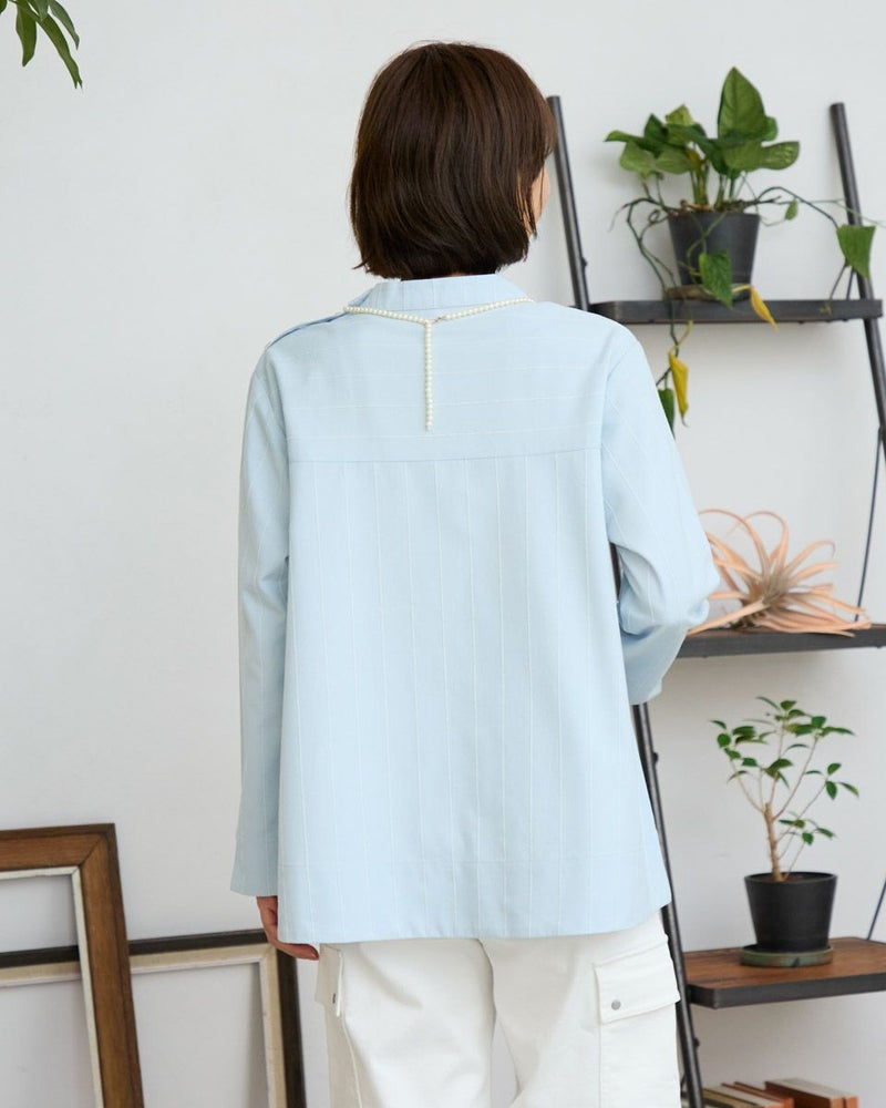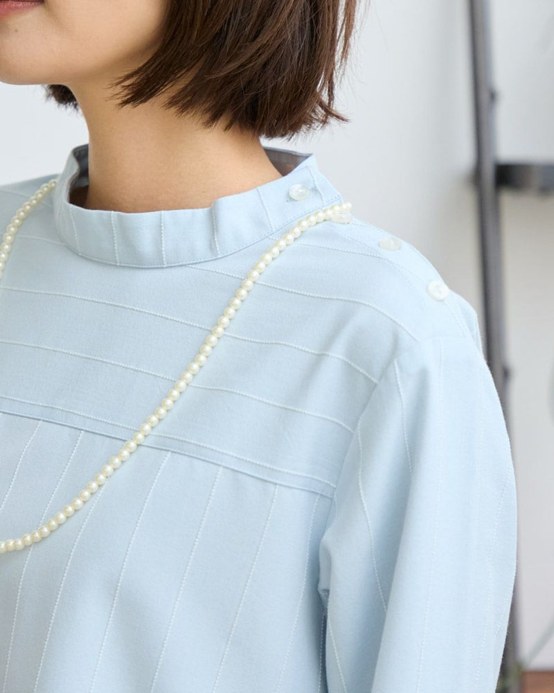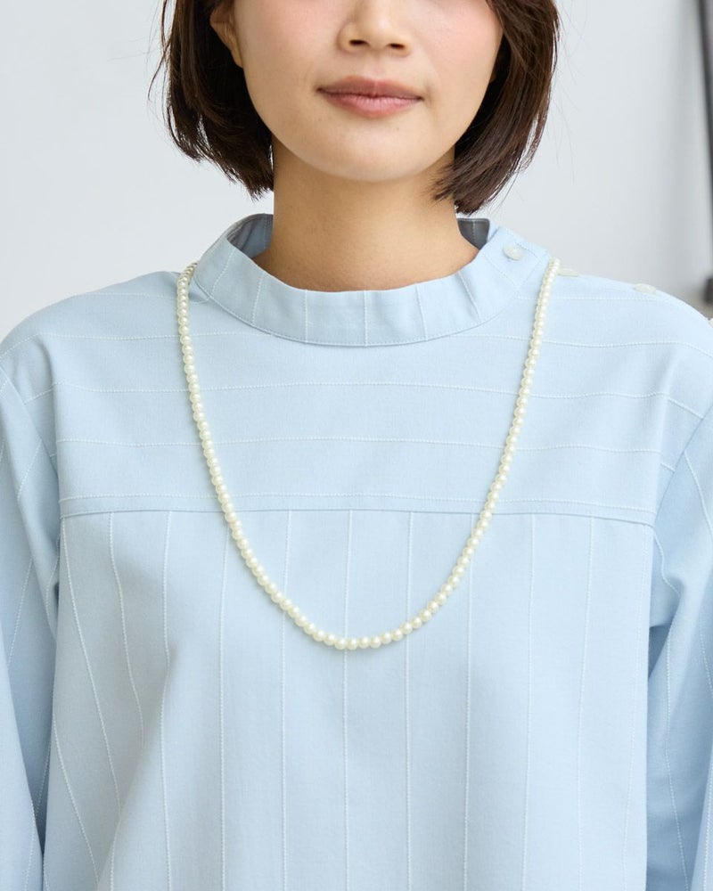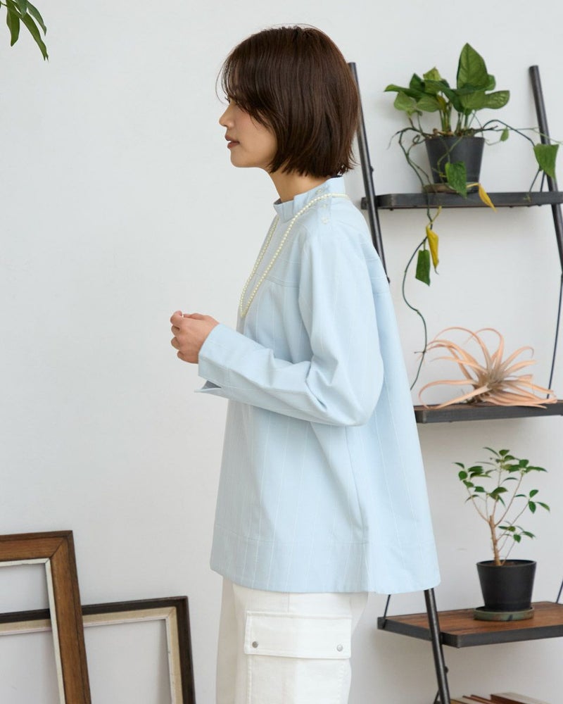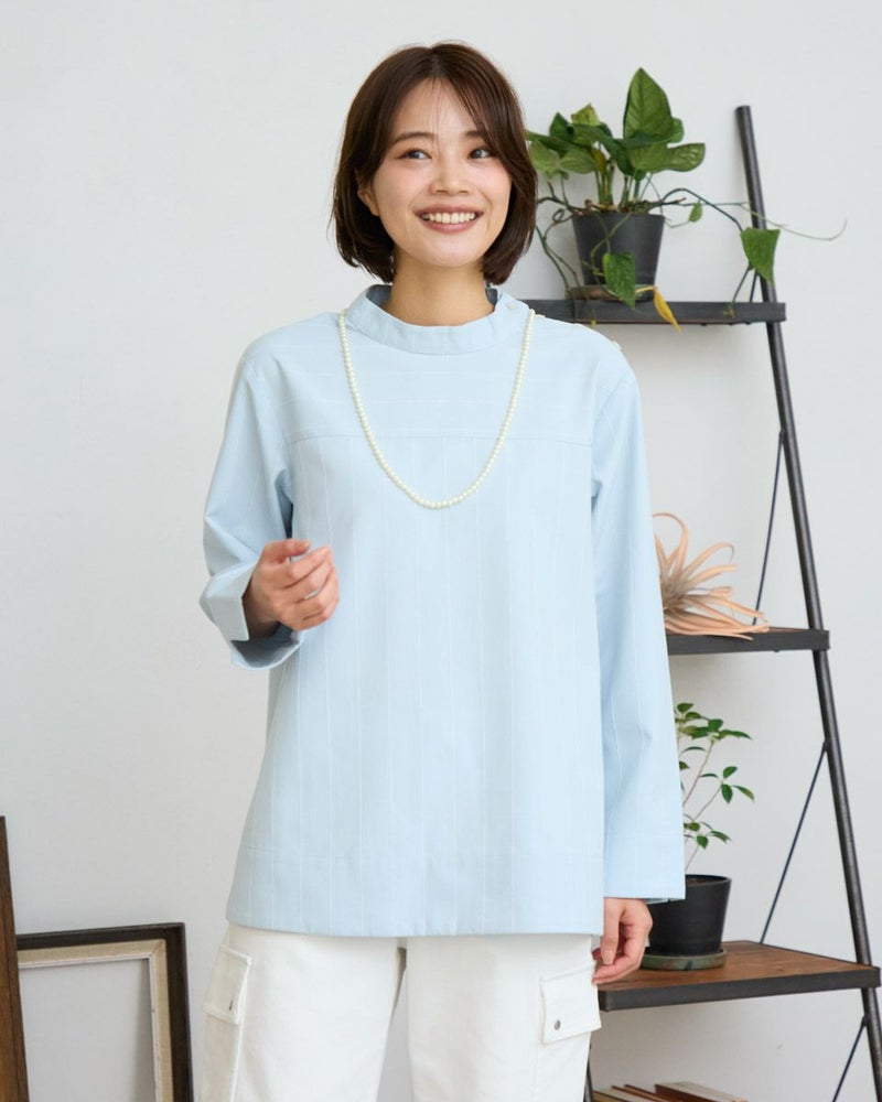 立体感のある微配色ストライプ柄が特徴のかぶりブラウスです。袖口はスリットを入れることで折り返し易い仕様です。女性らしいフレアシルエットはテーパードパンツと相性が抜群です。 モデル身長: 167 cm 着用サイズ: M サイズ Golden Bear WOMEN ブラウス (WOMEN) 【着用アイテム】467RD701 ストレートカーゴパンツ