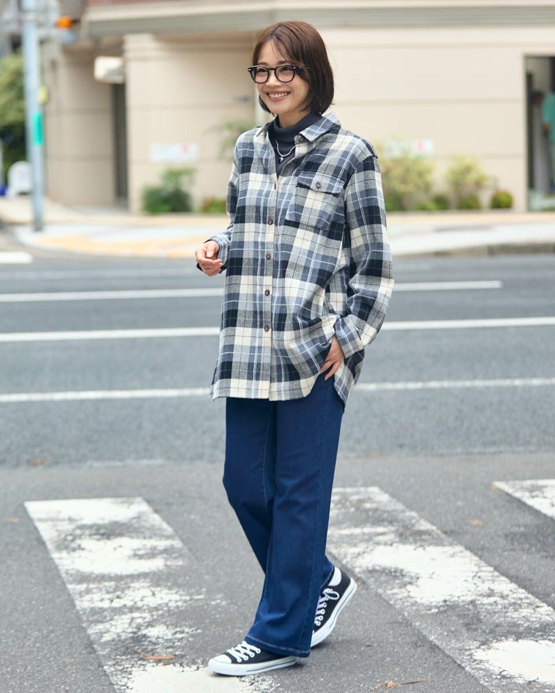 ほどよい厚みのある生地で仕立てた、チェック柄のシャツ。一枚着としてはもちろん、ライトアウター感覚で羽織りとしても活躍するアイテムです。ゆったりとしたシルエットで、ラフに着こなすだけでこなれた印象に。季節の変わり目や気温調整にもぴったりな、カジュアルスタイルの頼れる一着です。 モデル身長: 167 cm 着用サイズ: M サイズ Golden Bear WOMEN ブラウス (WOMEN) 同デザイン大きい(3L,4Lサイズ)はこちら 【着用アイテム】467RE433 吸湿発熱タートルネック長袖Tシャツ 467RC702 超ストレッチパウダーデニム 468RC751 デニムスカート