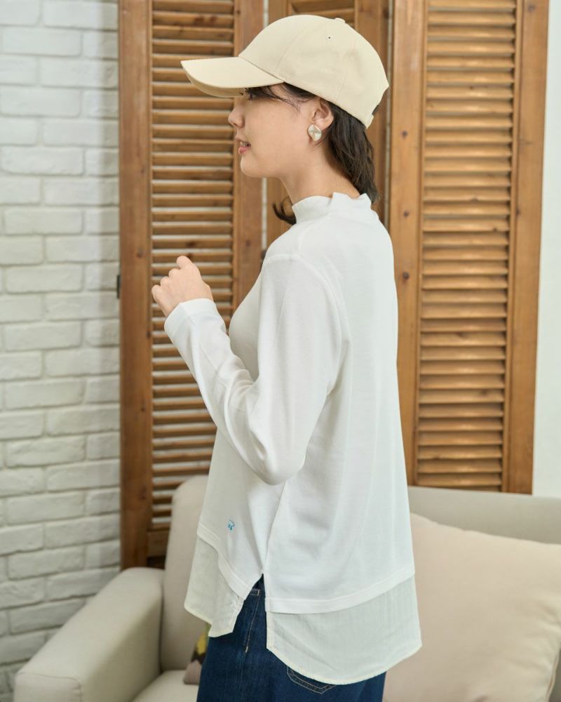 ハイネックカットソーをベースに、裾部分に布帛素材を切り替えました。身頃と袖は柔らかく伸縮性のあるカットソーで仕立てており、快適な着心地を実現。裾の布帛部分が重ね着した際にブラウスのようなレイヤードスタイルを演出し、コーディネートに華やかさをプラスします。一枚で着ても、インナーとしても使いやすい万能なアイテムです。