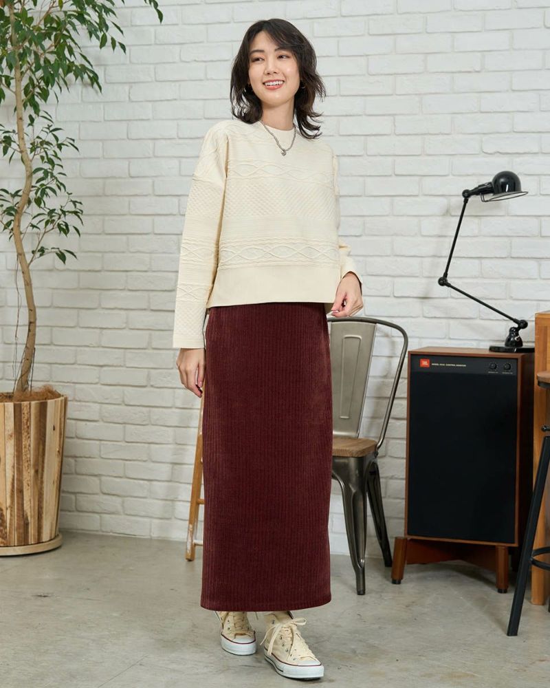 ケーブルニットのような表情豊かな編み柄をカットソー素材で表現した、見た目も着心地もやさしいトップス。ニット見えしながらも軽やかに着られる、ニットが苦手な方にもおすすめのアイテムです。トレンド感のあるショート丈と、ゆとりのある身幅で、抜け感のあるシルエットに仕上げました。