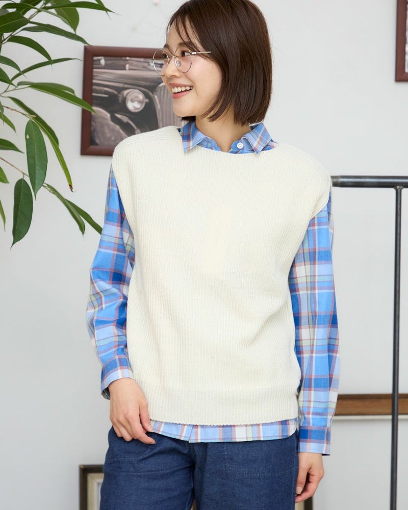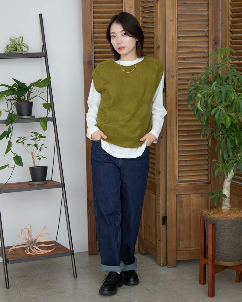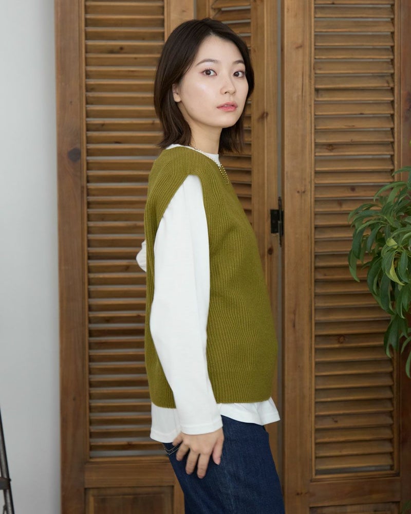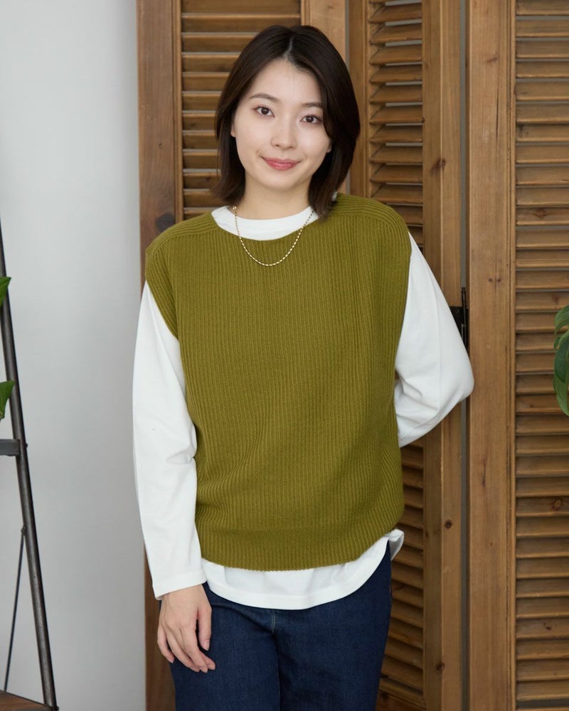 日本製の継ぎ目のないホールガーメントベストです。畦編みでふっくらとした風合いです。ボックスシルエットでボトムを選ばない着丈感。シャツやカットソーとの重ね着がしやすくレイヤードコーデにぴったりな1枚です。