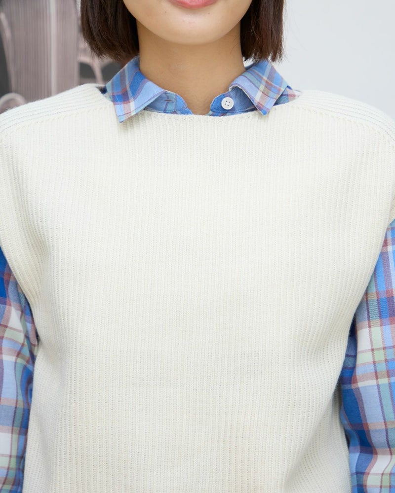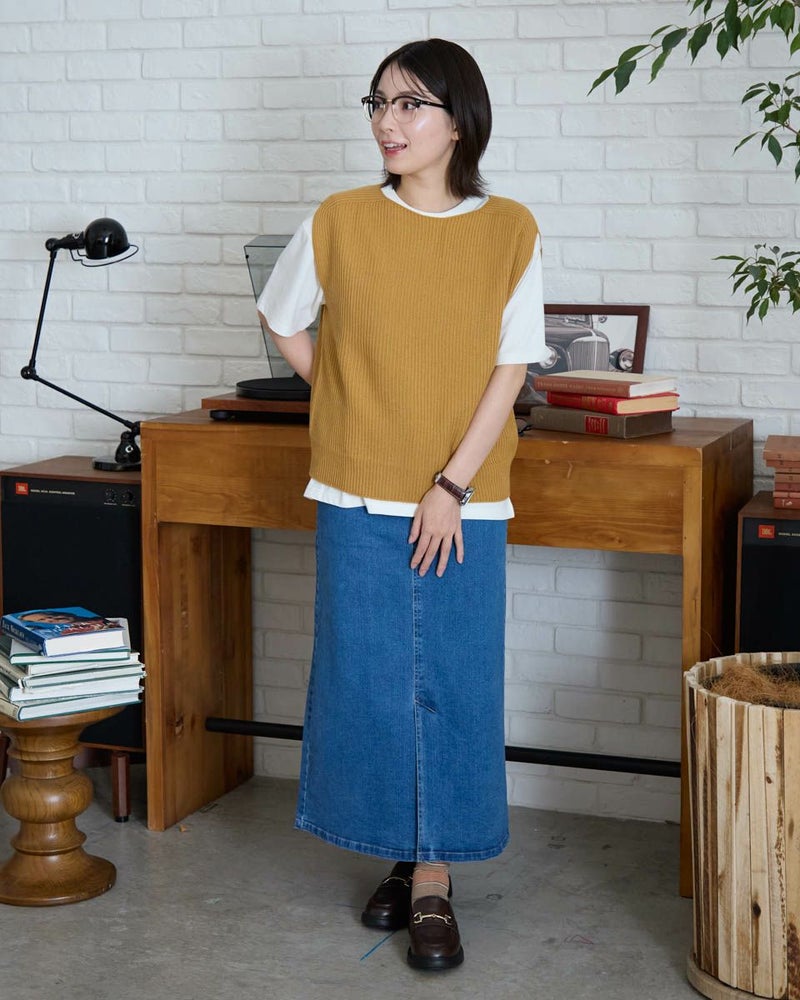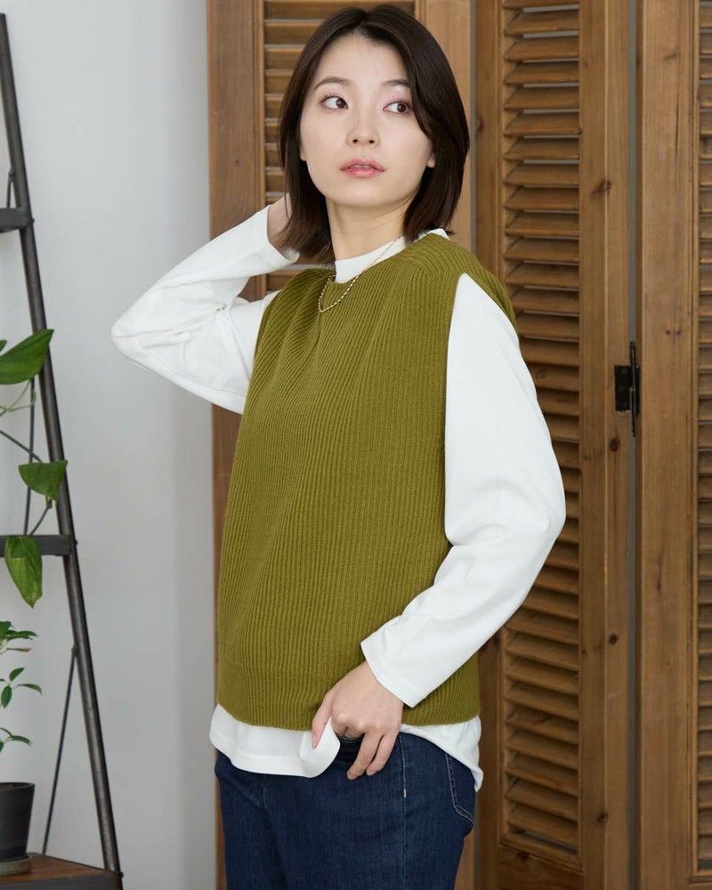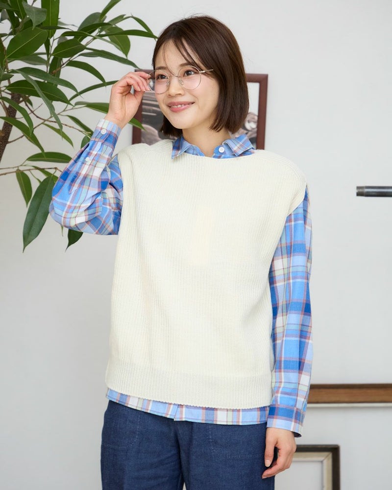 日本製の継ぎ目のないホールガーメントベストです。畦編みでふっくらとした風合いです。ボックスシルエットでボトムを選ばない着丈感。シャツやカットソーとの重ね着がしやすくレイヤードコーデにぴったりな1枚です。