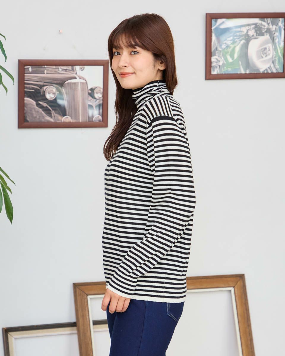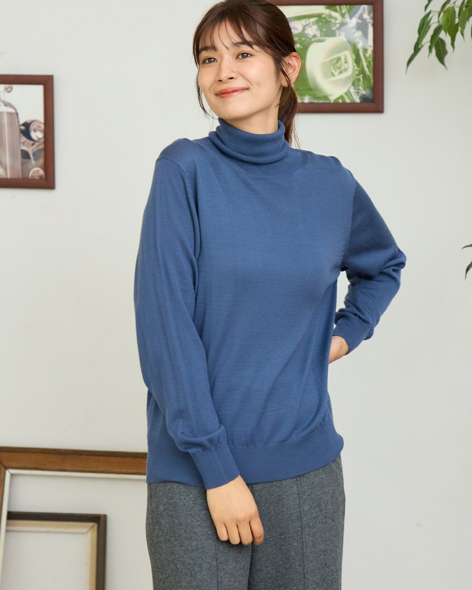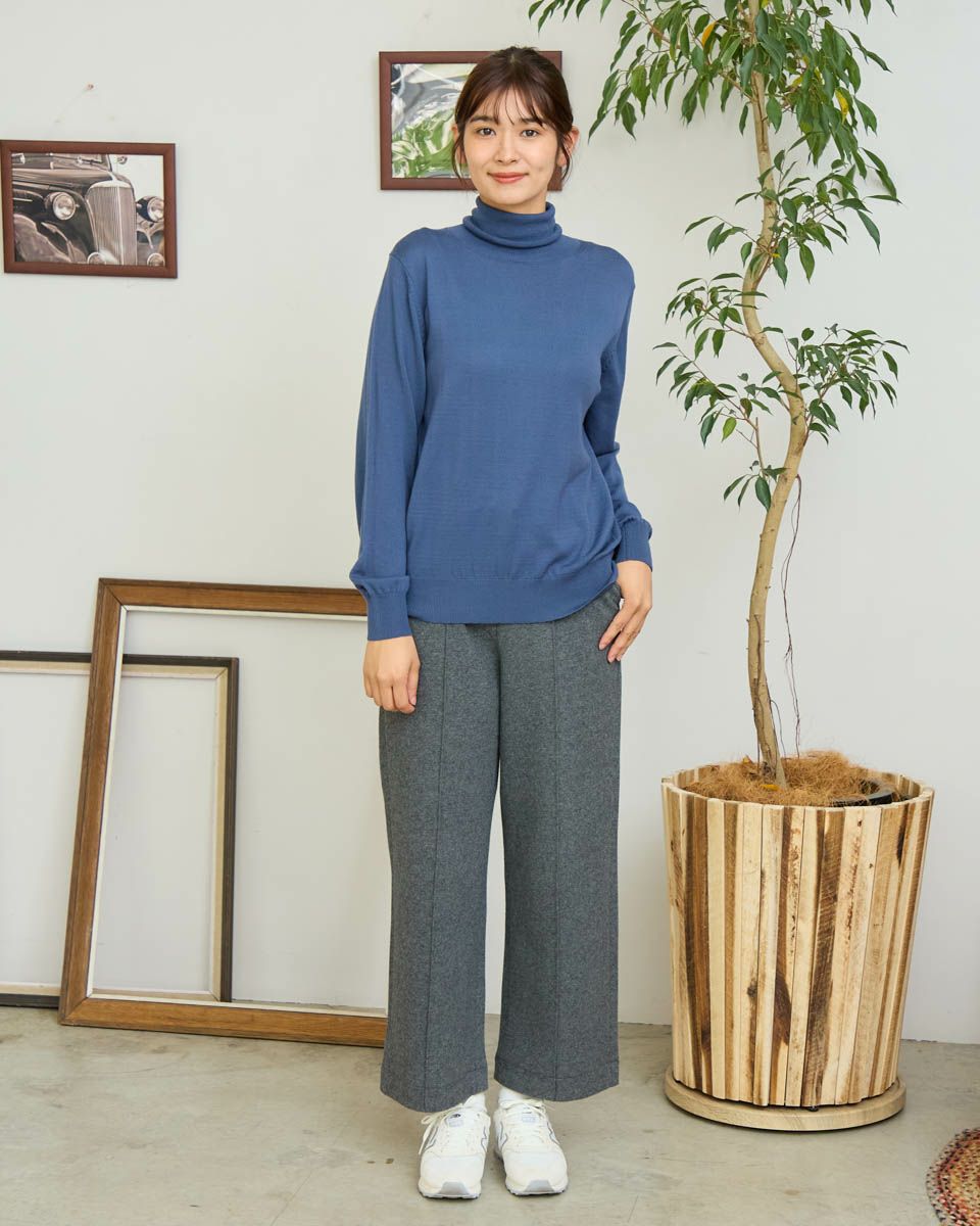 ウォッシャブルウール100%使用の重ね着でも1枚でも重宝するタートルネックニットです。袖口と裾をスカラップにしてアクセントにしています。 モデル身長: 168 cm 着用サイズ: M サイズ Golden Bear Ladies' ニット (Ladies') 【着用アイテム】467R8710 ストレートチノパンツ 467RD710 セミワイドニットパンツ 467RD711 裏起毛テーパードパンツ 467RD010 ファーマフラー