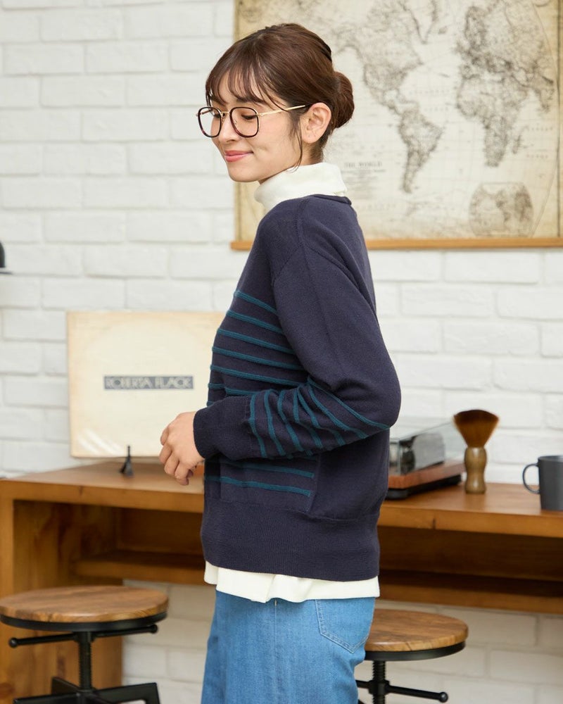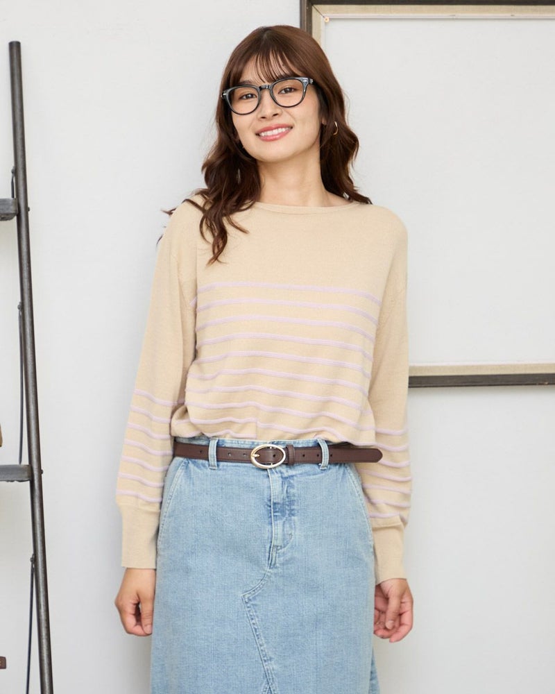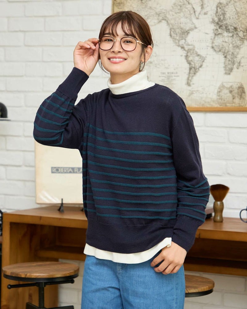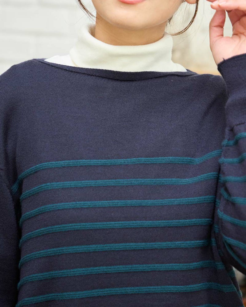 日本製のニットです。ホールガーメントで編み立て、ボートネックですっきりとした首周りです。ボーダーをガーター編みで凹凸感を出し立体感をプラス。前見頃はボーダー、後ろ見頃は無地と前後で表情が違いベーシックの中にも個性を出した1枚です。