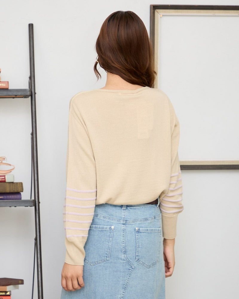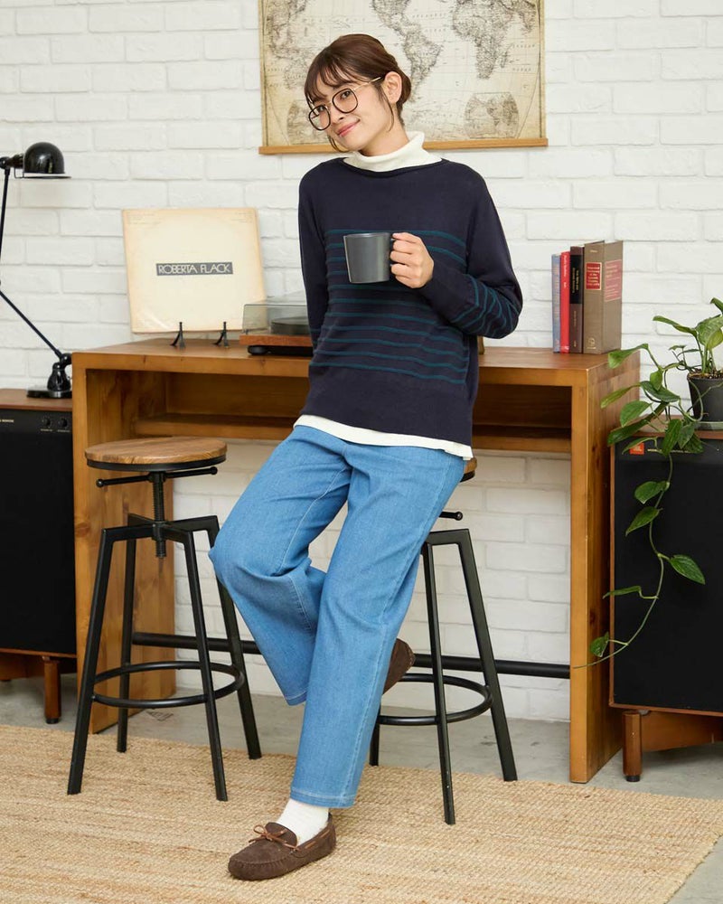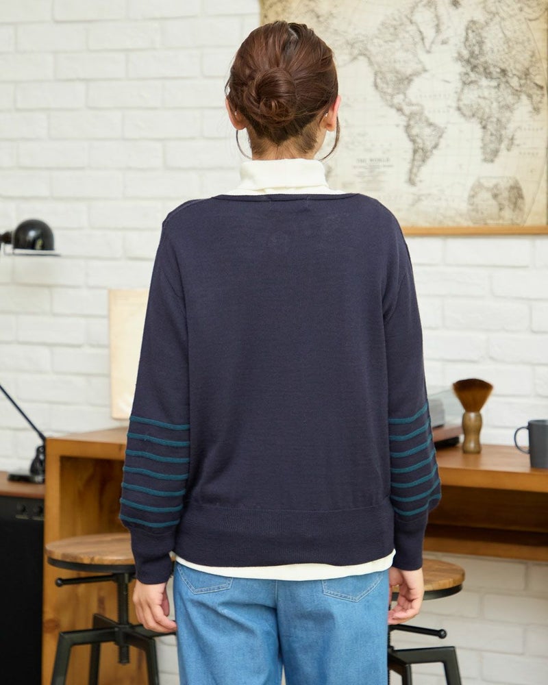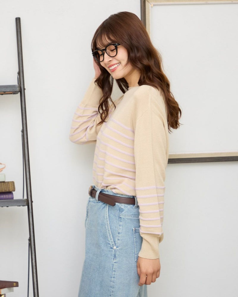 日本製のニットです。ホールガーメントで編み立て、ボートネックですっきりとした首周りです。ボーダーをガーター編みで凹凸感を出し立体感をプラス。前見頃はボーダー、後ろ見頃は無地と前後で表情が違いベーシックの中にも個性を出した1枚です。