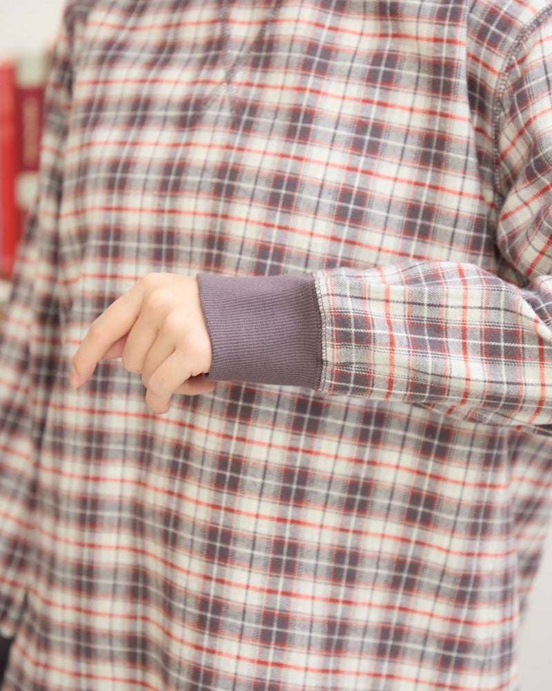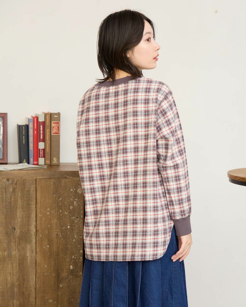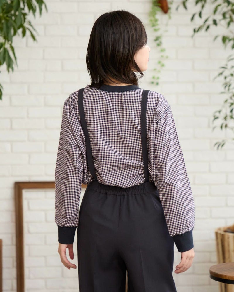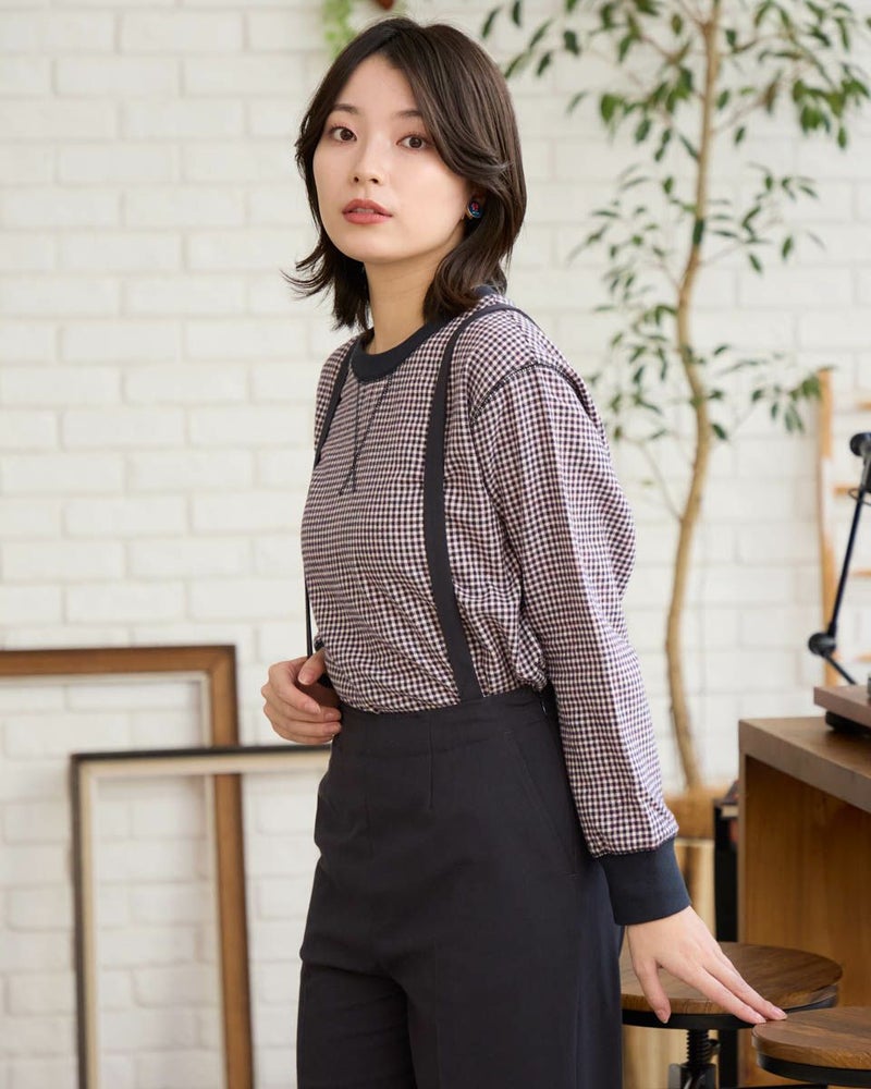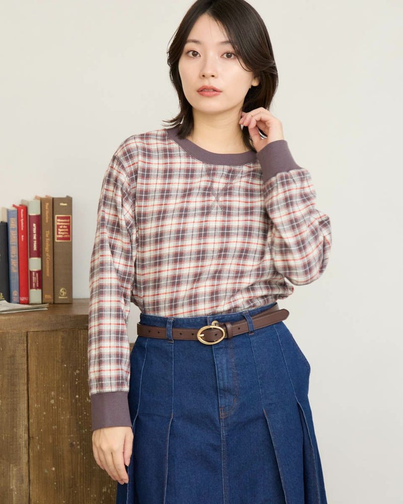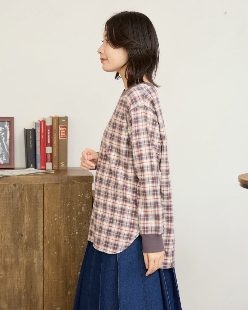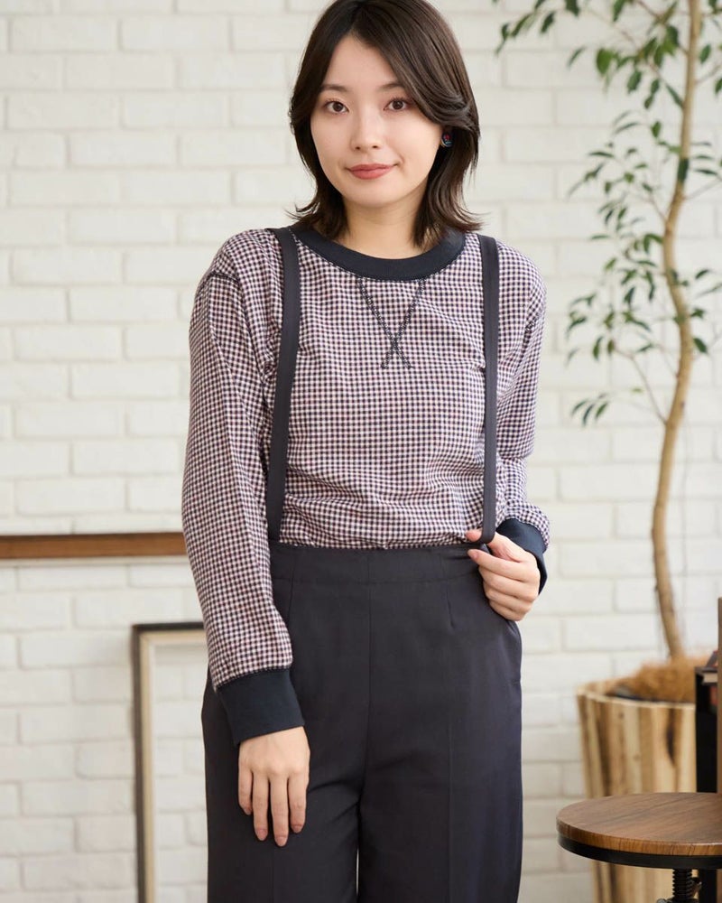 ウール混で暖かみのある長袖Tシャツのようなブラウスです。カットソーの長袖Tシャツのように、襟と袖口にリブを使用しました。裾をシャツテールにすることでインナーとしても着合せやすいデザインです。