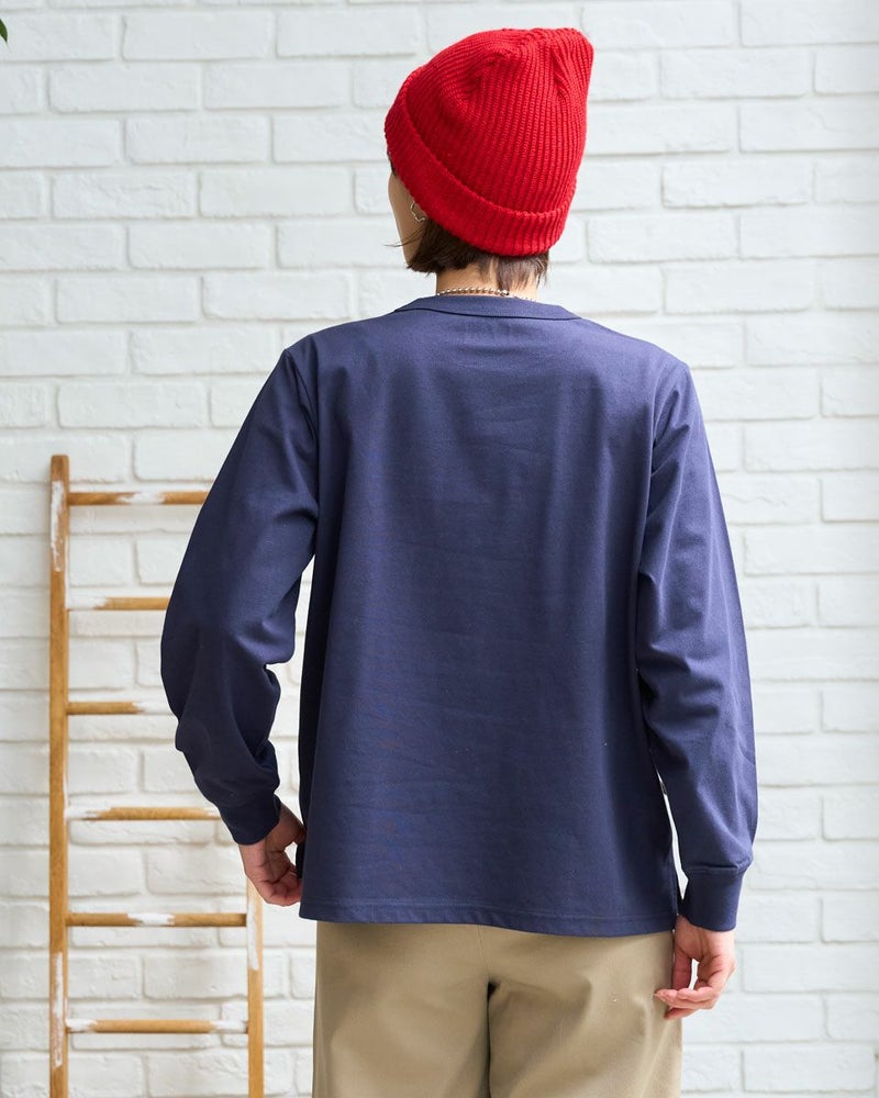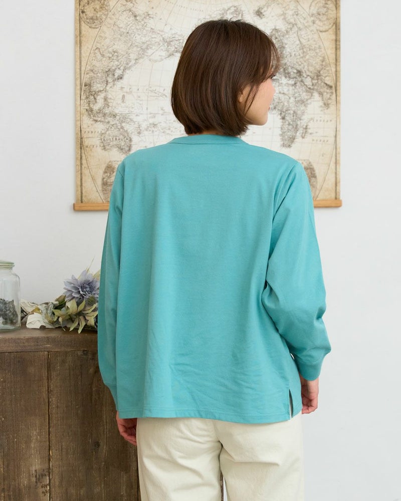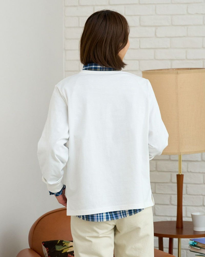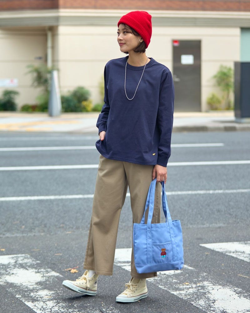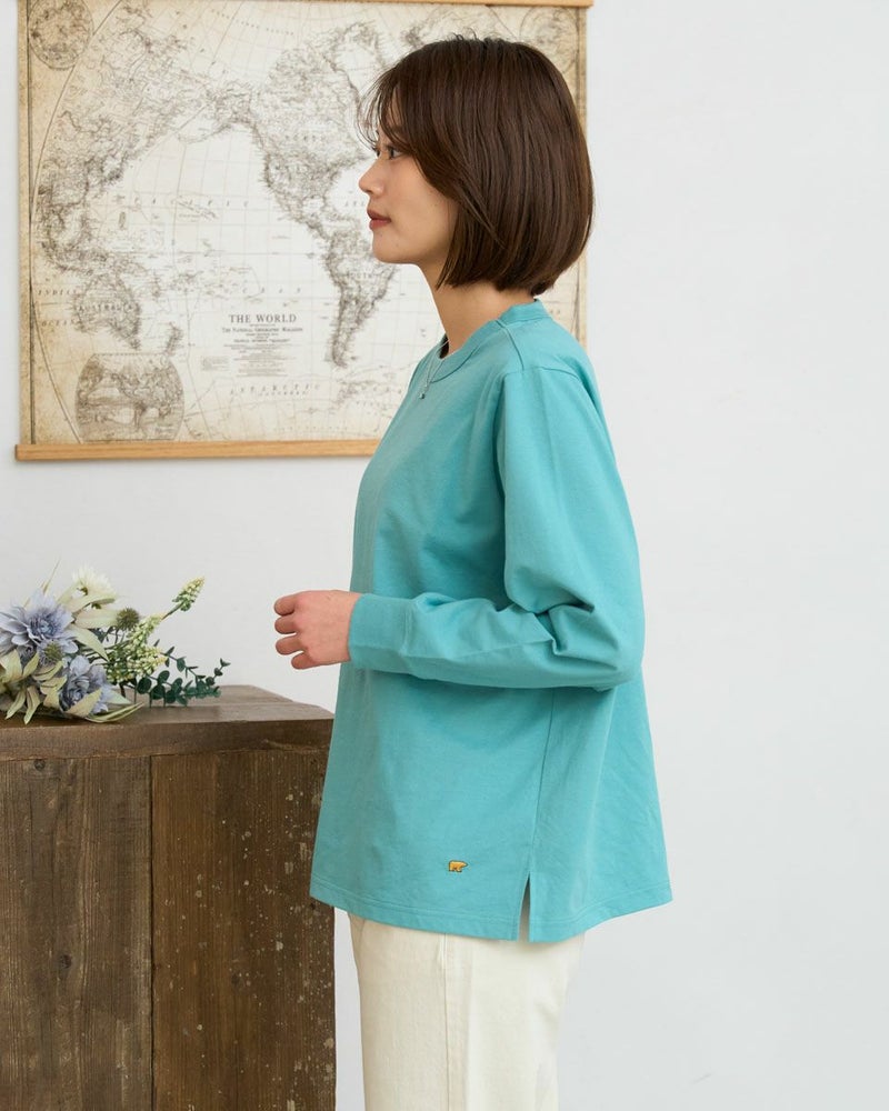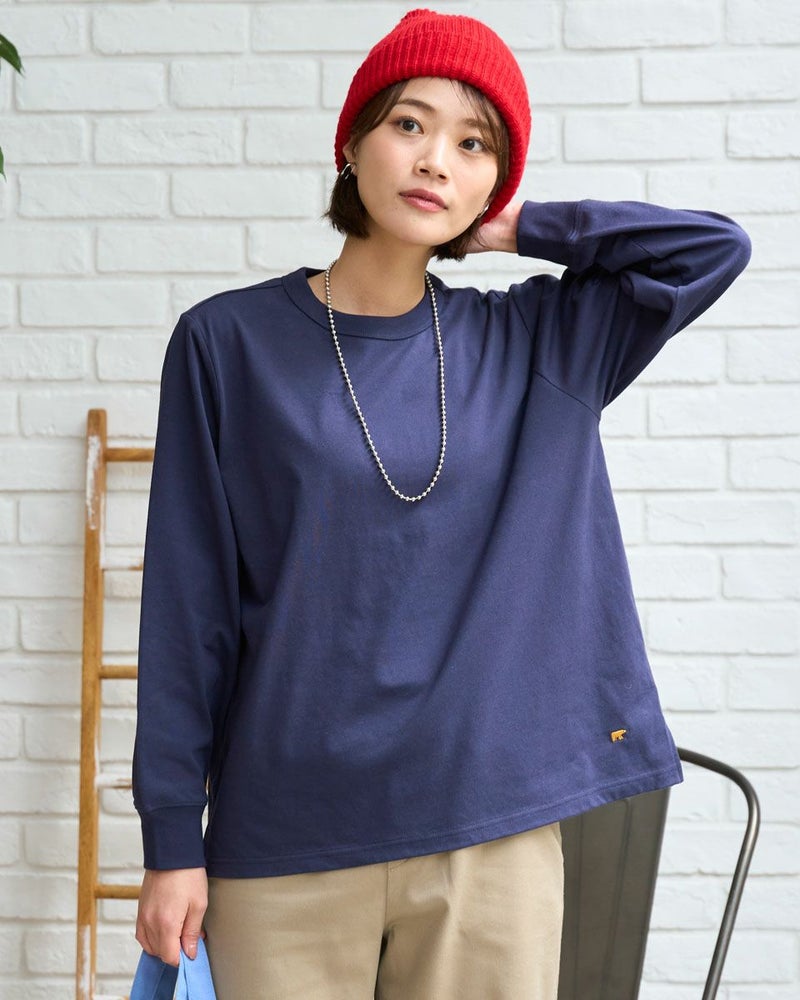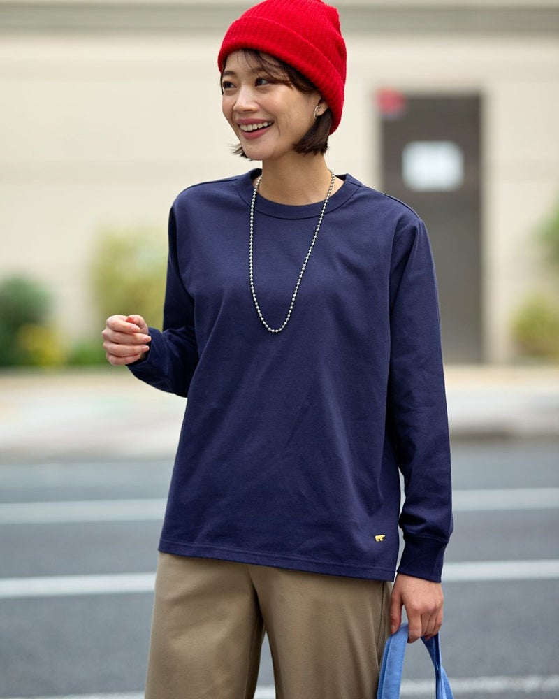 接触冷感・透け防止・吸水速乾性機能付き。滑らかな肌触りが特長のGB天竺を使用した長袖Tシャツ。襟ぐりは強度のあるフライスを使用、バインダー始末にすることでヨレにくいのが特徴です。裾にゴールデンベア刺繍付き。インナーにも活躍する程よい分量感の長袖Tシャツです。 モデル身長: 167 cm 着用サイズ: M サイズ Golden Bear WOMEN カットソー (WOMEN) 【着用アイテム】467U1302 カジュアルチェックシャツ 467U1701 リブ付きガウチョパンツ 467U1703 ツイルストレートパンツ 467U1002 JACKベアトートバッグ