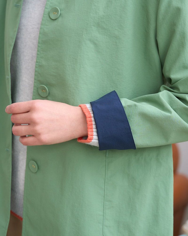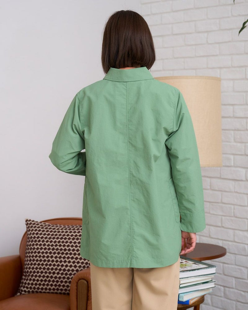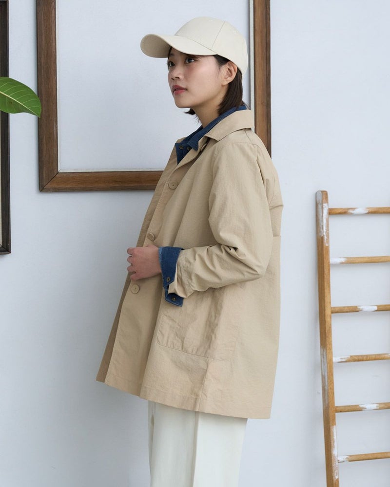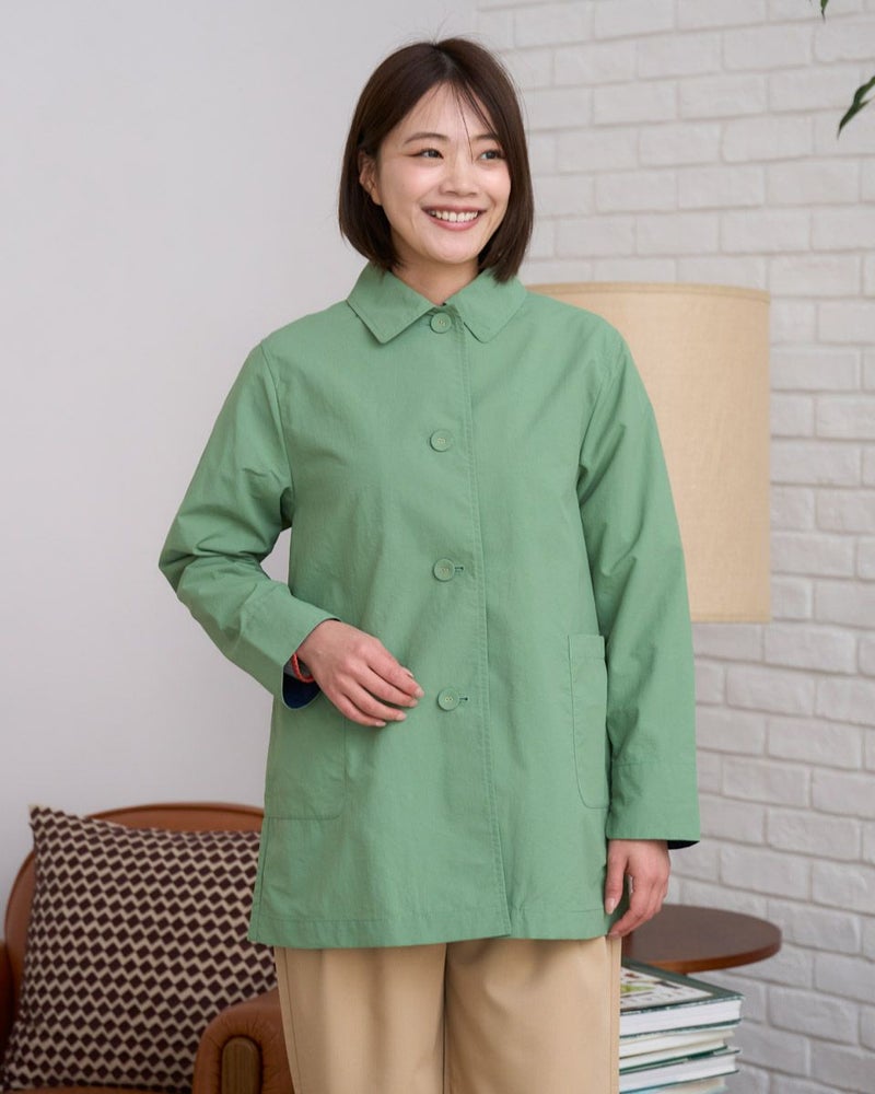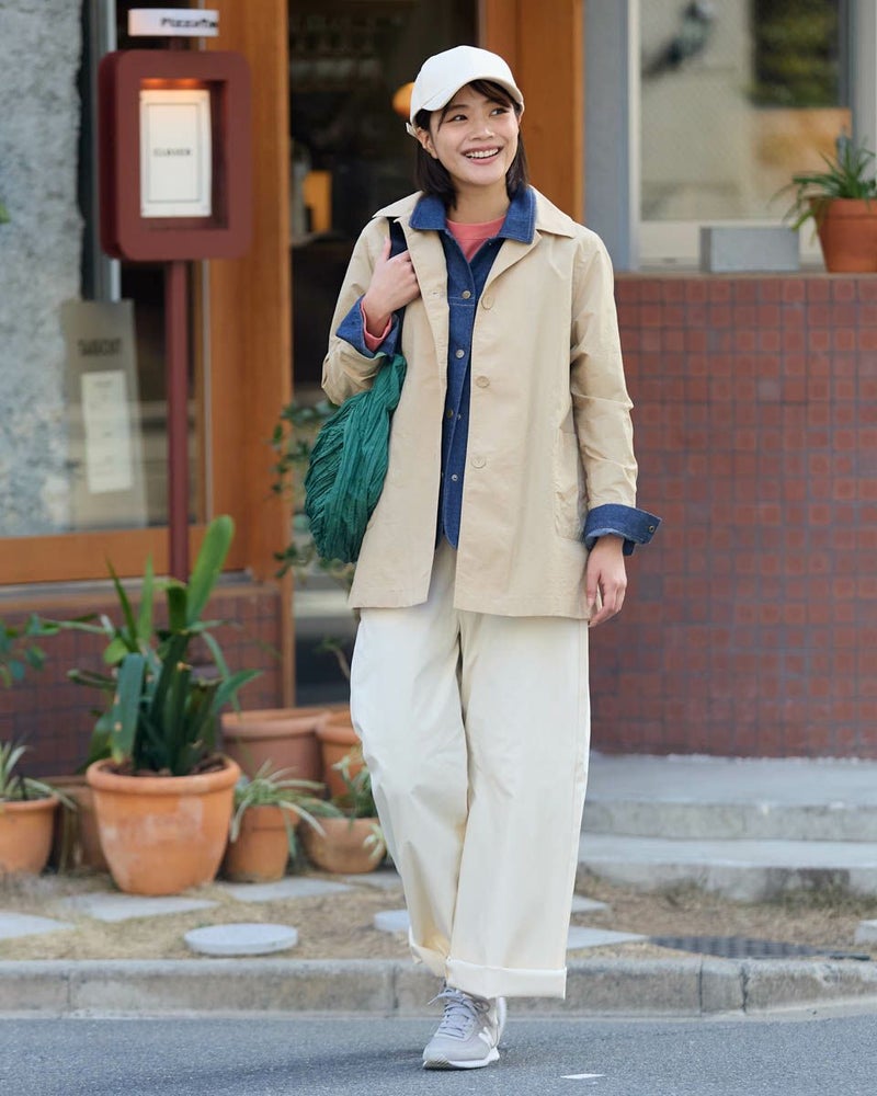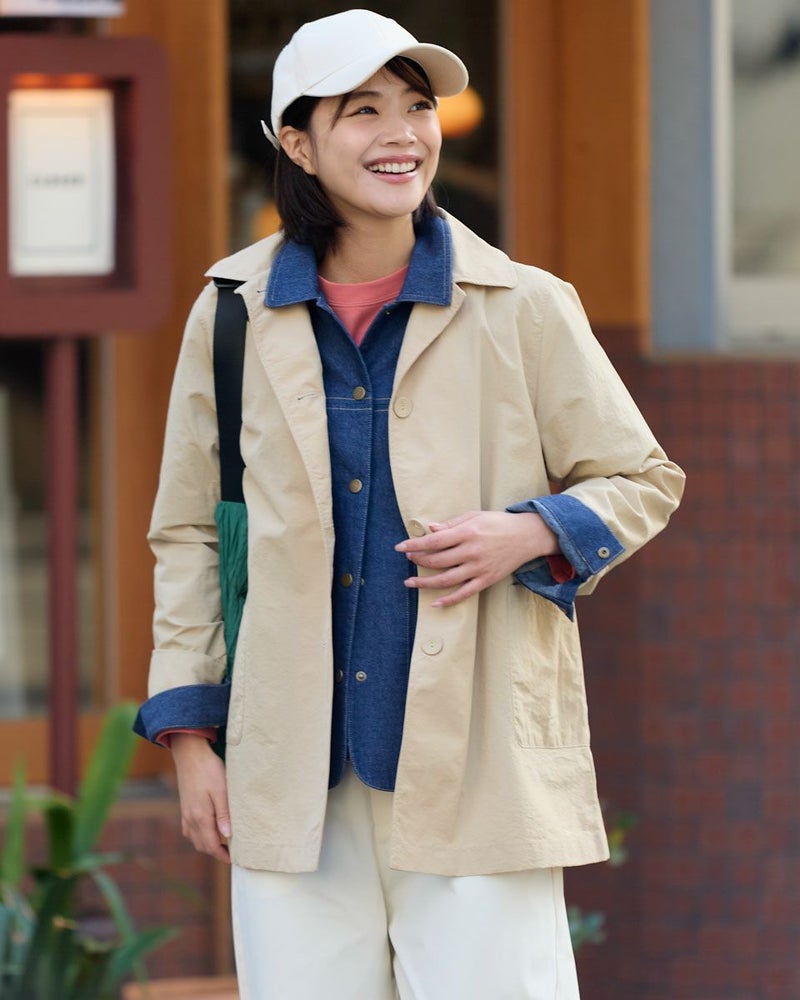 撥水機能と花粉ガード機能を備えたベーシックで使いやすい万能アウターです。フロントの大きめなくるみボタンがポイント。袖を折り返して袖裏の配色をアクセントとする着こなしもおすすめです。ひとえでサッと羽織ることができるライトアウターです。 モデル身長: 167 cm 着用サイズ: M サイズ Golden Bear WOMEN アウター (WOMEN) 同デザイン大きい(3L,4Lサイズ)はこちら メンズサイズはこちら 家族コーディネートアイテムはこちら 【着用アイテム】467U2601 オーガニックッコットンGB刺繍ニット 467U3404 裾ドロストカットソー 467U3431 GBポロシャツ 467U3711 ストレッチタックパンツ 468U3751 ストレッチチノパンツ