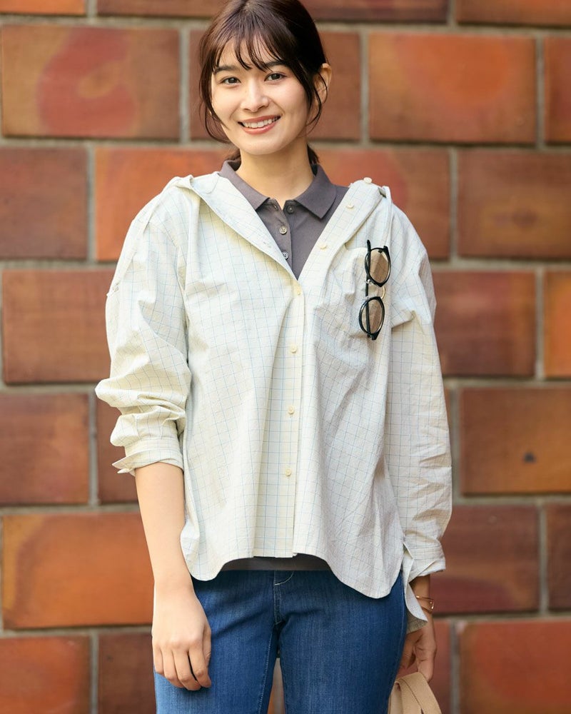 サラリと羽織れるフードシャツです。羽織としてだけではなく、ベストやジャケットの下にレイヤードしたりシーズンレスで着用できるのもポイントです。 モデル身長: 168 cm 着用サイズ: M サイズ Golden Bear WOMEN ブラウス (WOMEN) 【着用アイテム】467U3402 プリントTシャツ 467U3431 GBポロシャツ 467U3711 ストレッチタックパンツ 467U3712 接触冷感デニムテーパードパンツ 471U2101 金釦テーラードジャケット