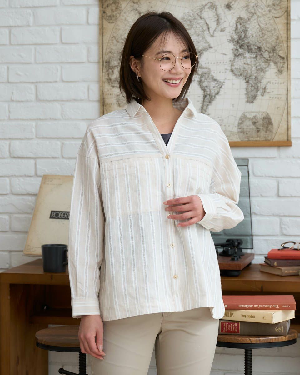 綿麻素材を清涼感のあるパナマストライプに仕上げました。一枚着でも羽織としても着用頂けます。台襟付きシャツカラーのスキッパーで両胸に大きめのポケット有ります。