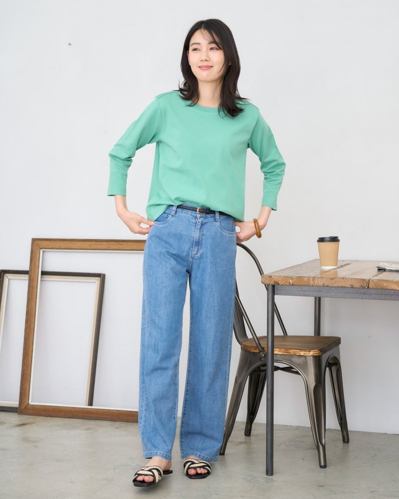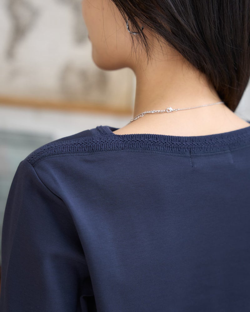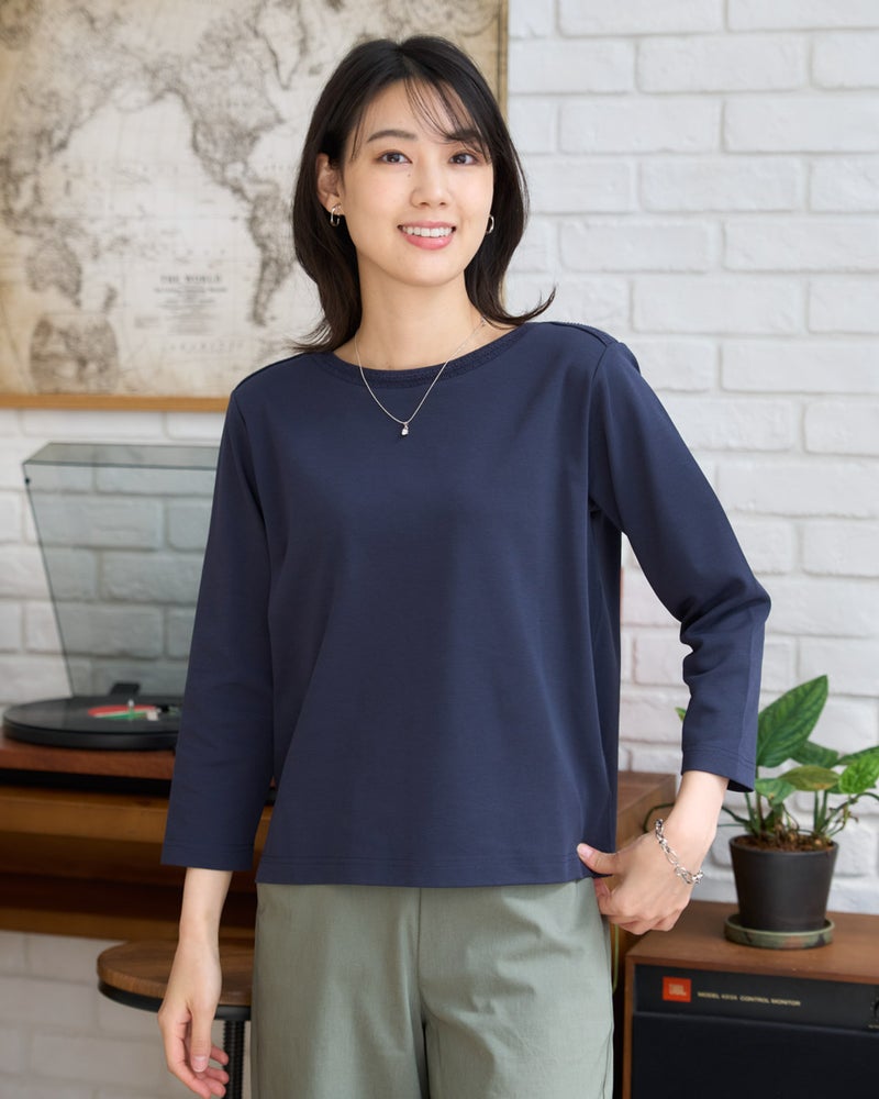 透かし柄のニット襟がポイントのカットソーです。透けのない程よい厚みと肌に気持ちの良いポンチ素材です。シンプルな形とさりげないディテールはデイリー使いに最適な一枚です。 モデル身長: 166 cm 着用サイズ: M サイズ Golden Bear WOMEN カットソー (WOMEN) 【着用アイテム】467U2331 デニムシャツ 467U4701 綿麻ストレートデニム 467U4730 超ストレッチ麻混ガウチョ