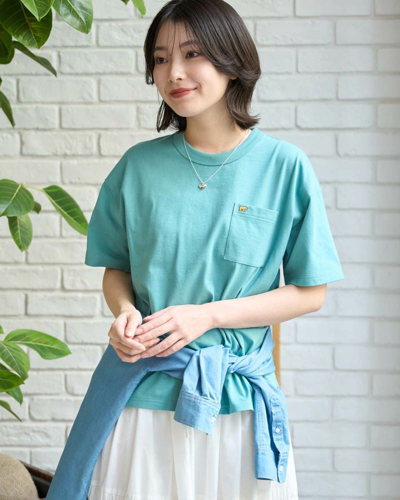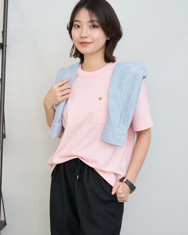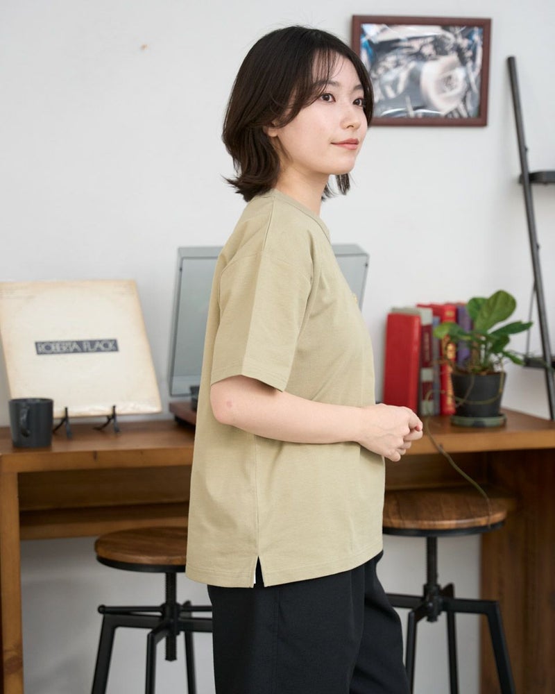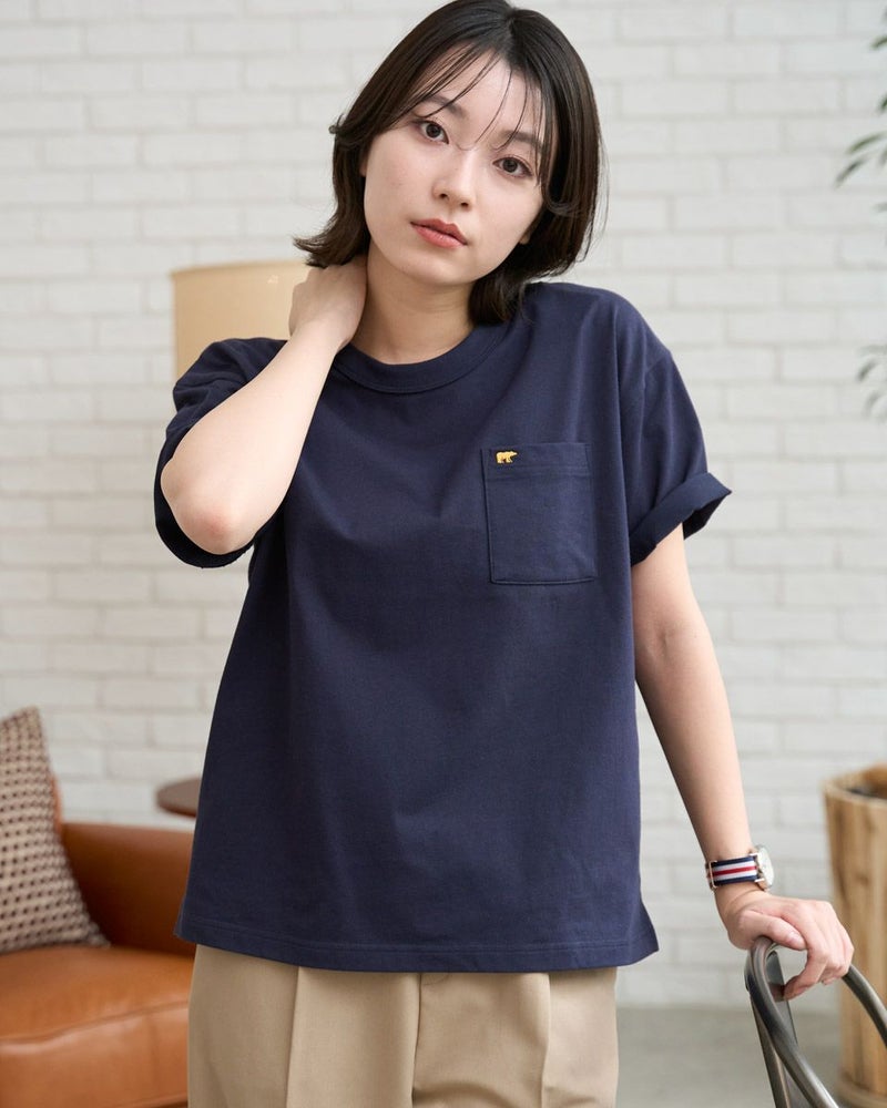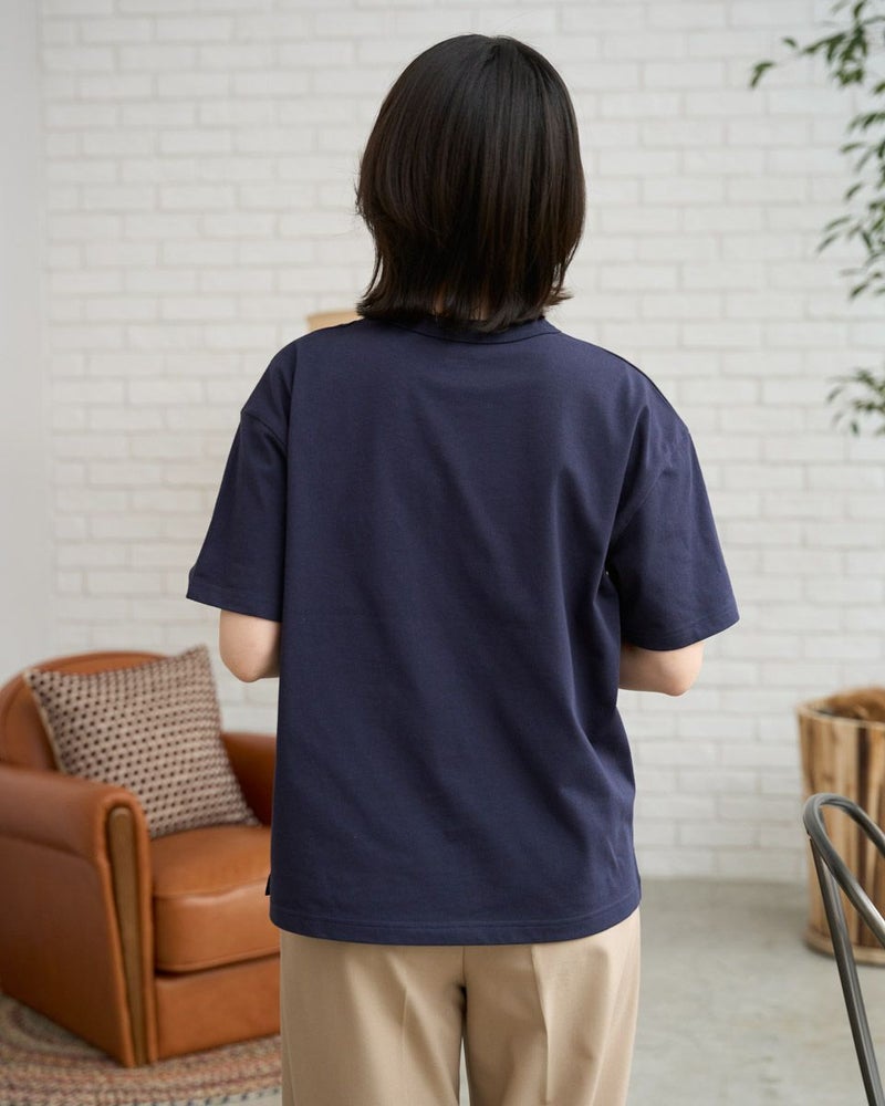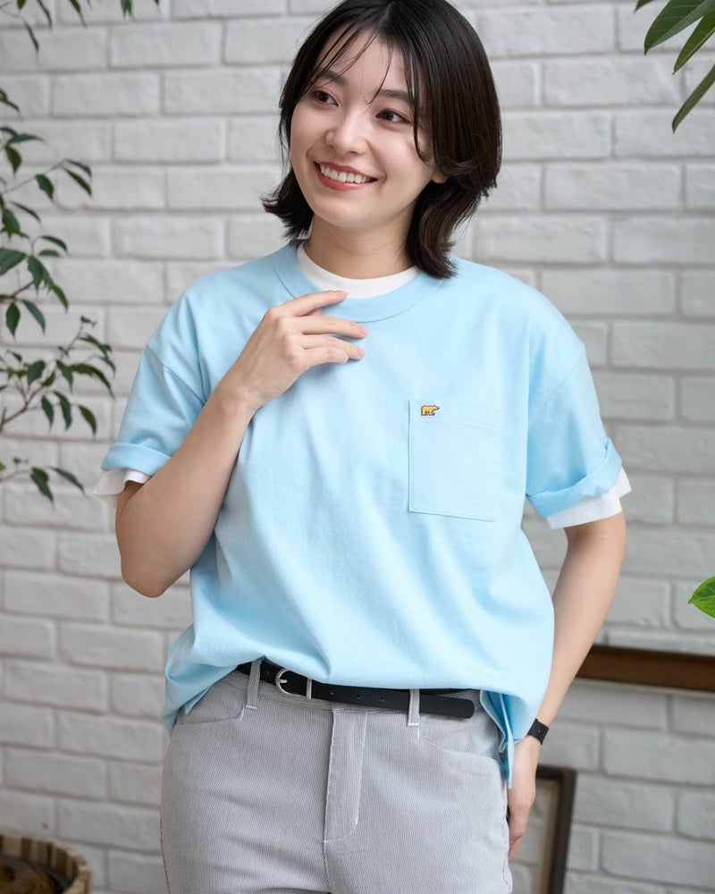 接触冷感・吸水速乾性機能付き。滑らかな肌触りが特長のGB天竺を使用したTシャツです。襟ぐりは強度のあるフライスを使用、バインダー始末にすることでヨレにくいのが特徴です。左胸ポケットにゴールデンベア刺繍付き。ドロップショルダーの五分袖で全体にゆったりとした分量感です。 モデル身長: 162 cm 着用サイズ: M サイズ Golden Bear WOMEN カットソー (WOMEN) 同デザイン大きい(3L,4Lサイズ)はこちら キッズサイズはこちら メンズサイズはこちら 家族コーディネートアイテムはこちら 【着用アイテム】467U1701 リブ付きガウチョパンツ 467U2703 シャーリングスカート 468U2750 ストレートストレッチパンツ 467RD011 キルトトートバッグ